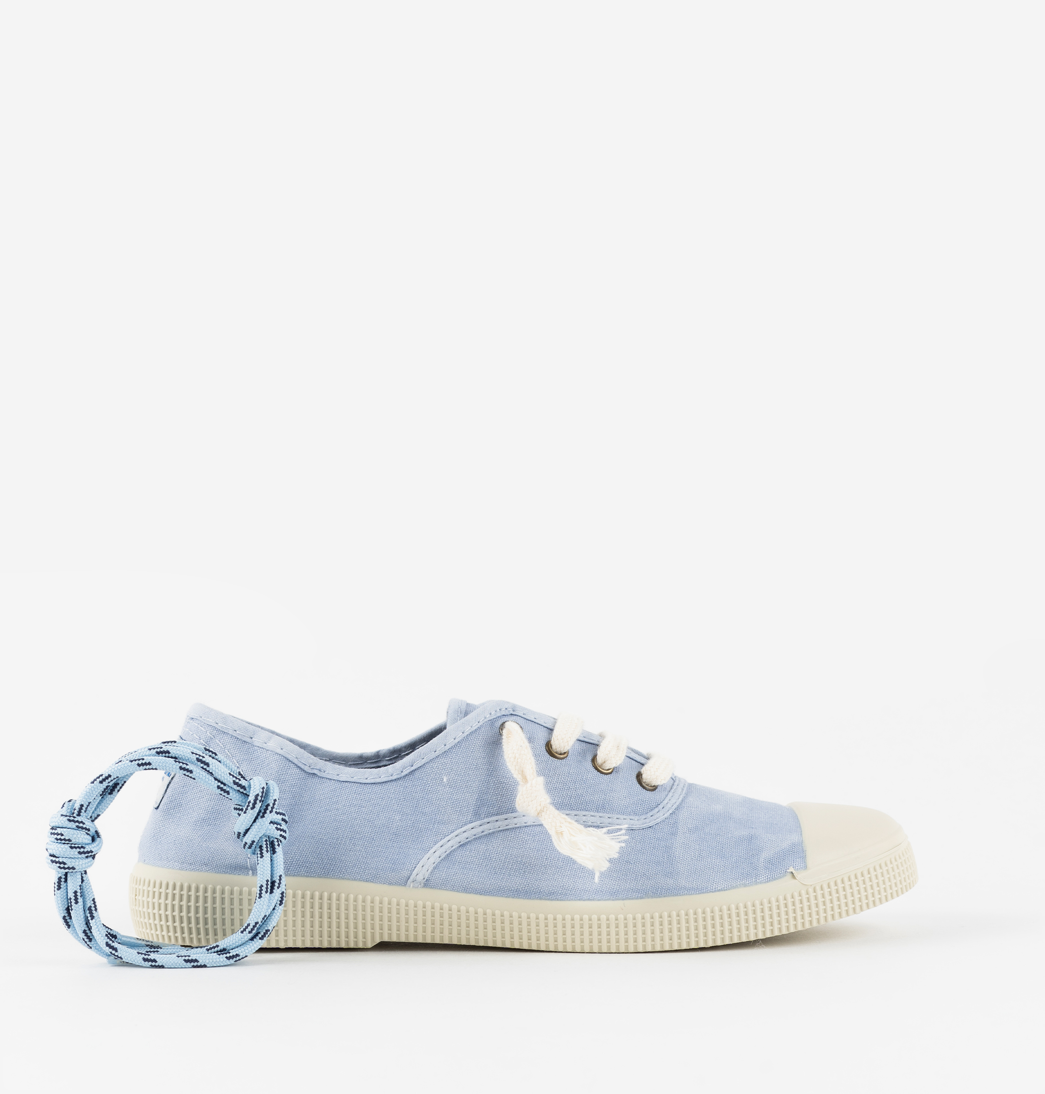 Estas zapatillas de lona para mujer y hombre están fabricadas en una combinación única de algodón reciclado DREC® (Dyeable Recycled Eco Cotton) y algodón ecológico cultivado, hilado y tejido en España. Se presentan con un ligero efecto envejecido. Incorporan cierre con cordones en crudo e incluyen un segundo par de tipo redondo con estampado. Cómoda suela de caucho vulcanizado con refuerzo en la puntera, para una mayor resistencia y durabilidad.