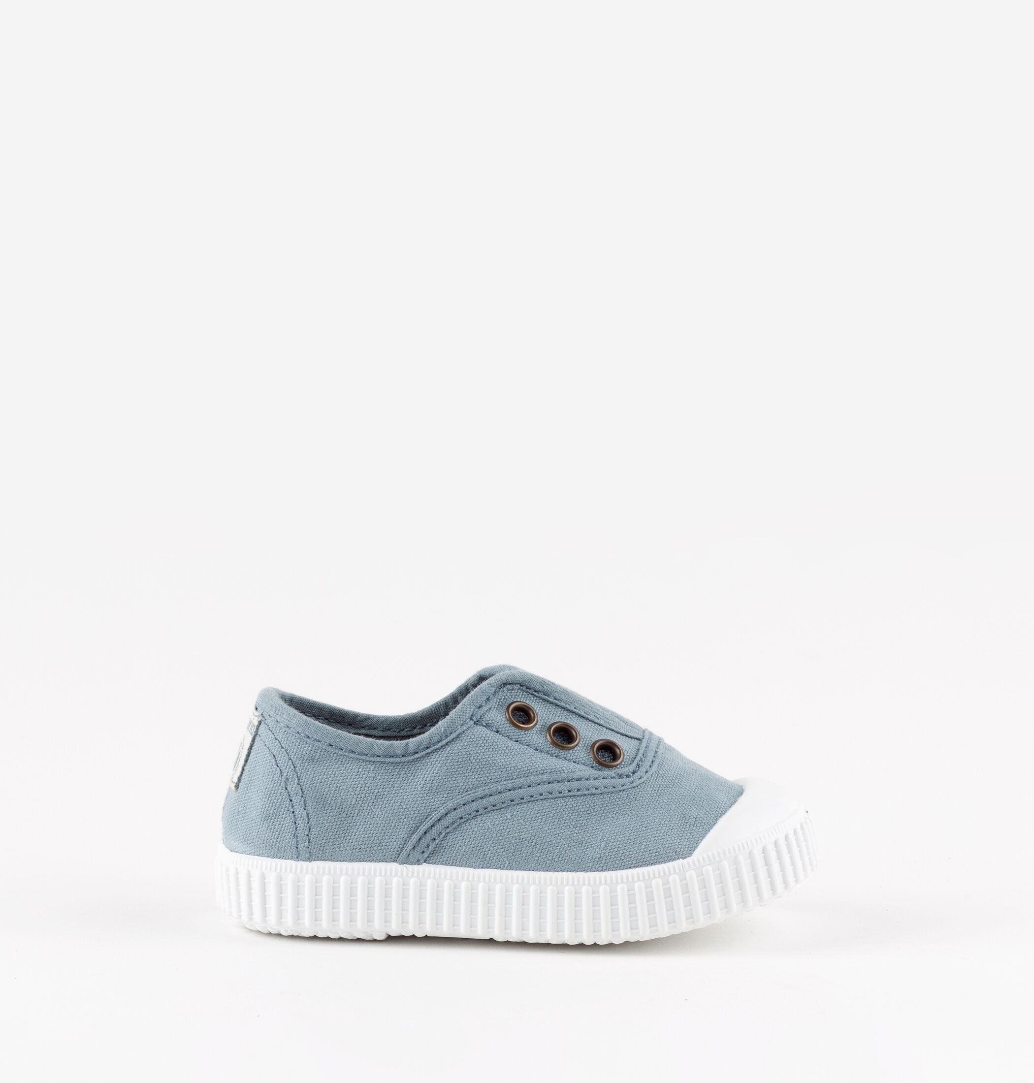 Zapatillas de lona sin cordón para niños fabricadas en una combinación única de algodón reciclado DREC® (Dyeable Recycled Eco Cotton) y algodón ecológico cultivado, hilado y tejido en España.