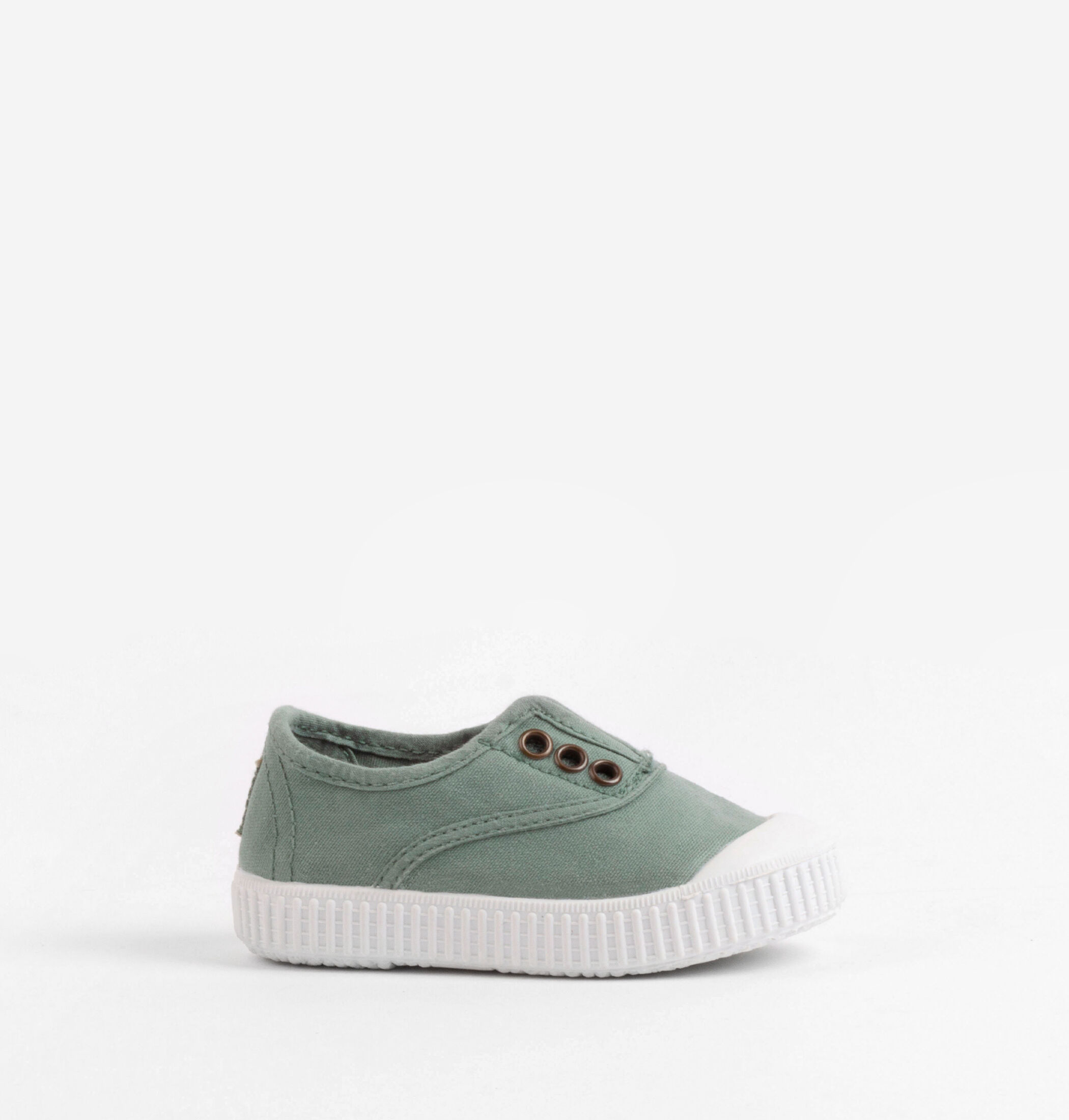 Zapatillas de lona sin cordón para niños fabricadas en una combinación única de algodón reciclado DREC® (Dyeable Recycled Eco Cotton) y algodón ecológico cultivado, hilado y tejido en España.