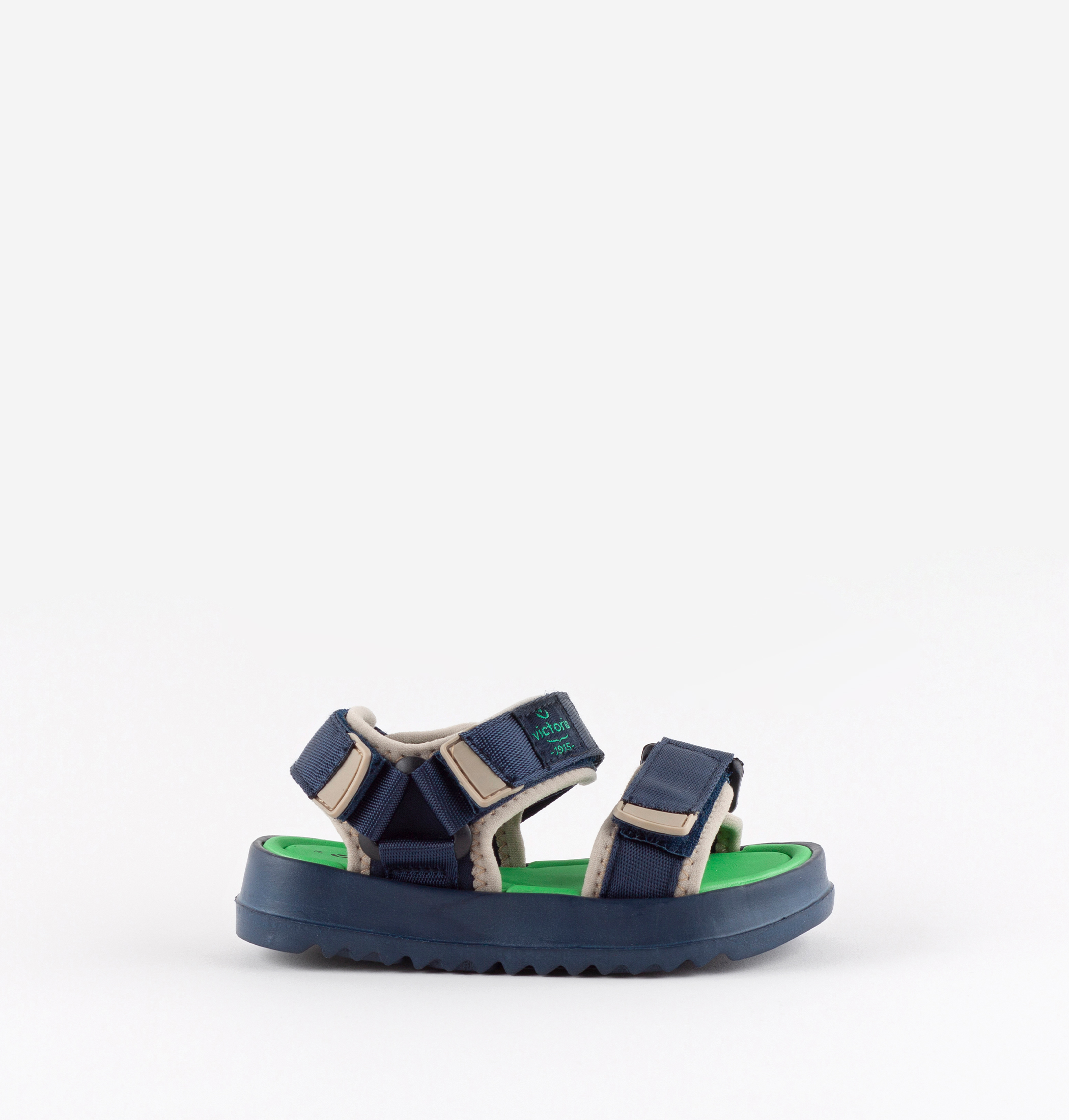 Sandalias para niños fabricadas en nylon con cierre de tiras adherentes, que aportan sujección y facilitan el calce, fomentando su autonomía. Detalle de color en la plantilla en contraste y suela de EVA en sierra antideslizante para un mayor agarre.
