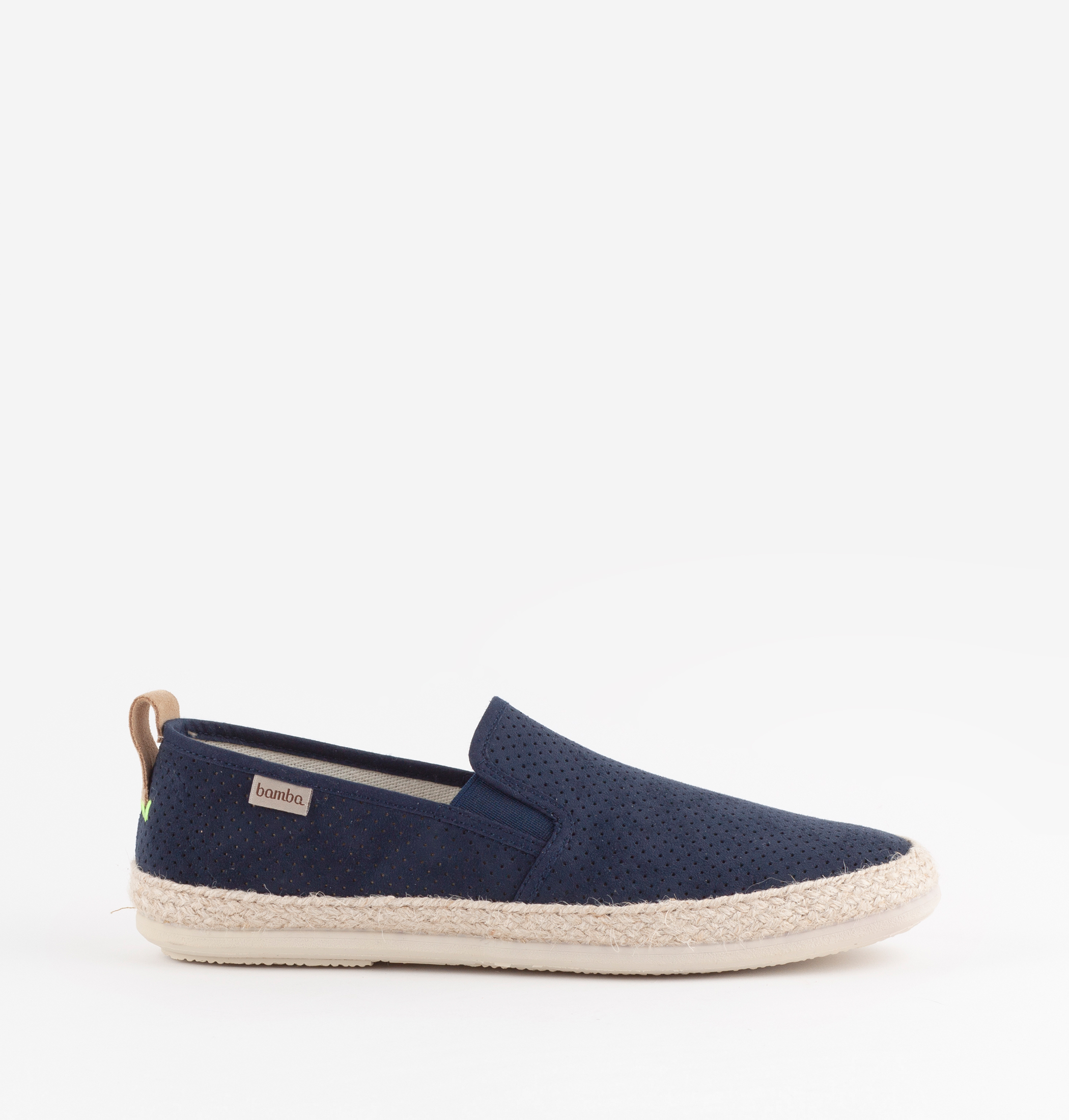 Alpargatas para hombre fabricadas en España en antelina perforada. Incorporan dos elásticos laterales, que aportan sujección y comodidad. Etiqueta con el logotipo de bamba cosida en el lateral. Cuentan también con un tirador trasero para facilitar el calce. Suela de caucho vulcanizado con trenza de yute.