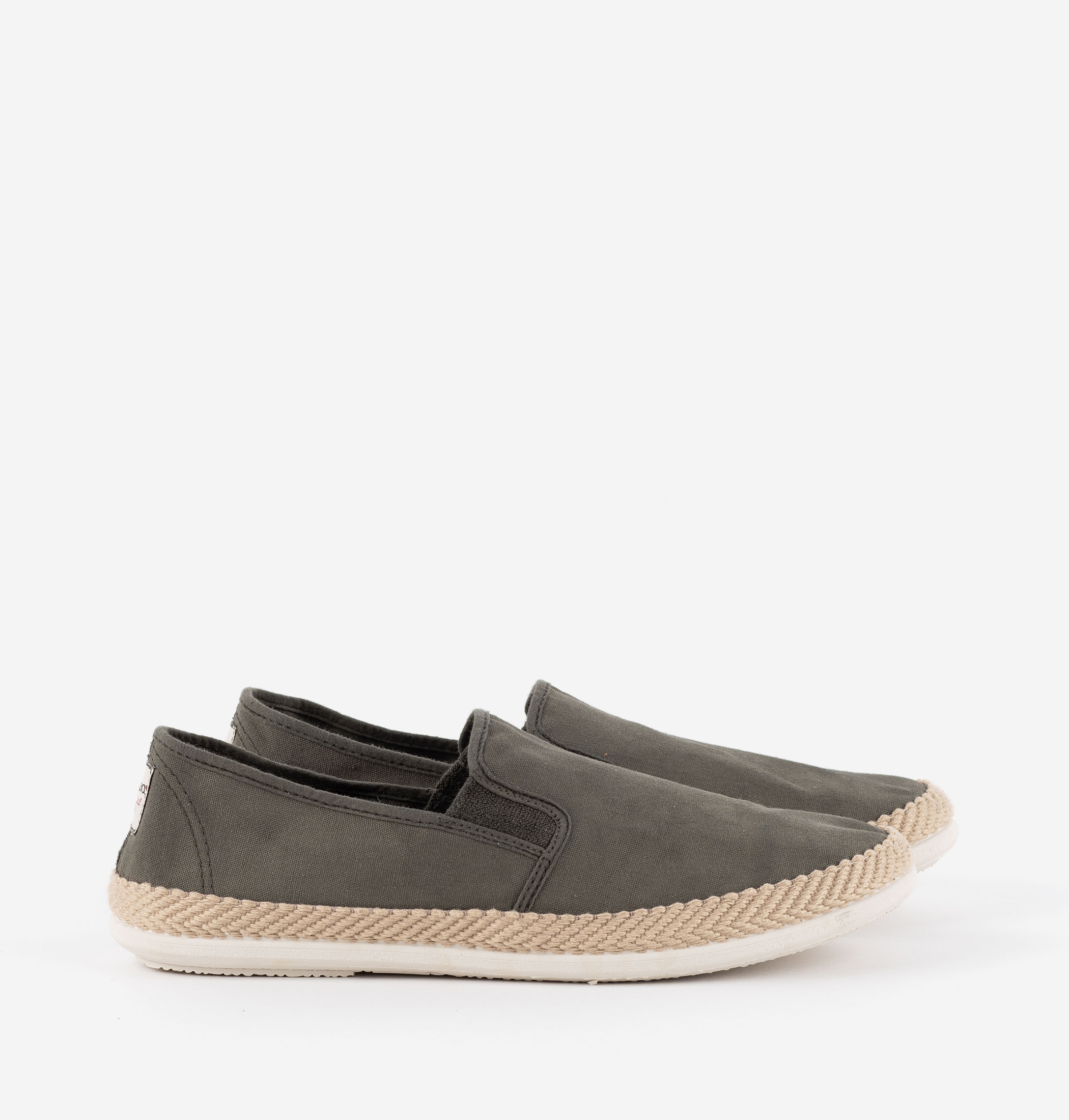Alpargatas para hombre fabricadas en España en lona tintada. Incorporan dos elásticos laterales, que aportan sujección y comodidad. Etiqueta con el logotipo de bamba cosida en la talonera. Suela de caucho vulcanizado con trenza de yute.