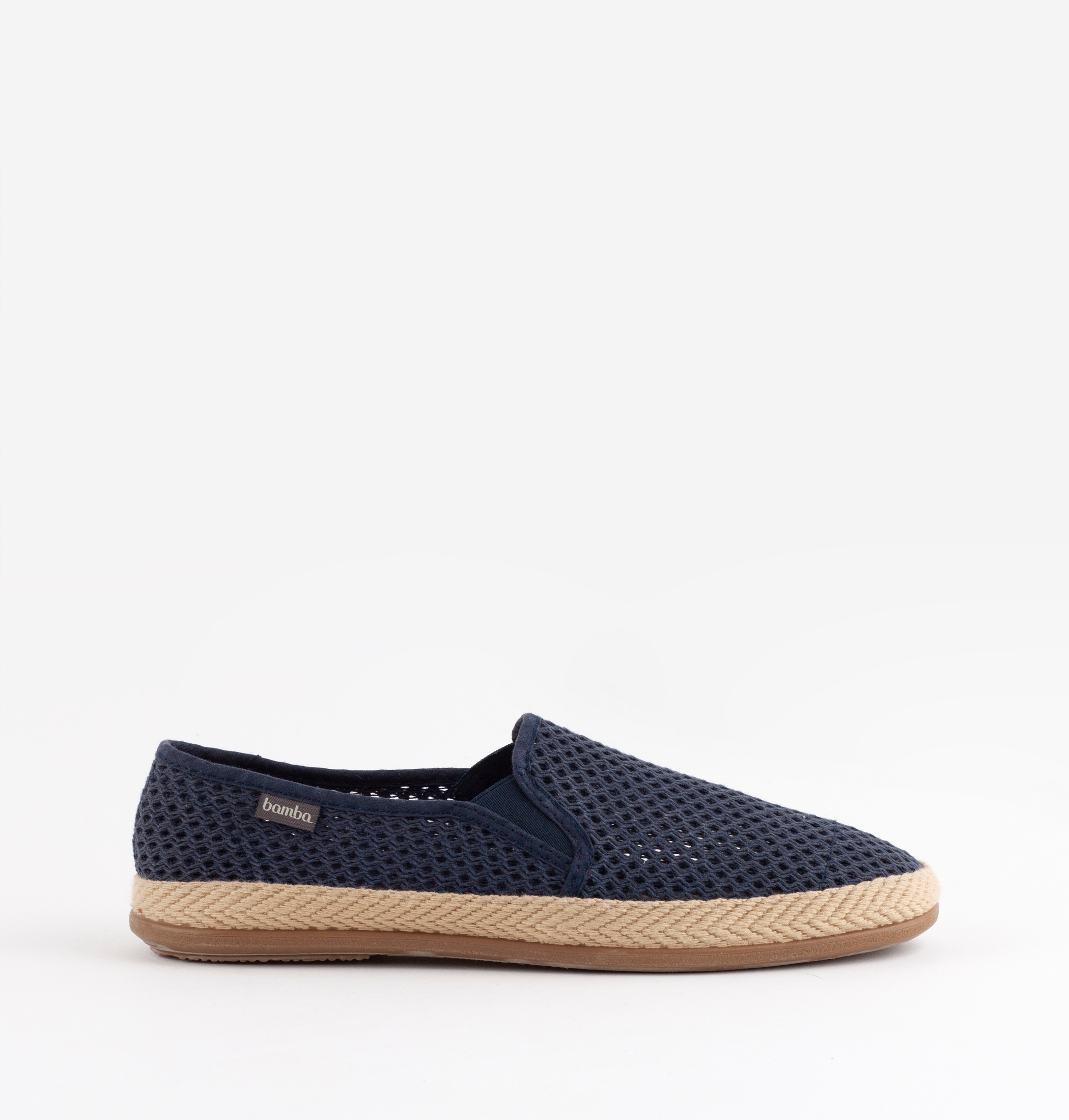 Alpargatas para hombre fabricadas en España en tejido tipo malla. Incorporan dos elásticos laterales, que aportan sujección y comodidad. Etiqueta con el logotipo de bamba cosida en el lateral. Suela de caucho vulcanizado en color caramelo con trenza de yute.