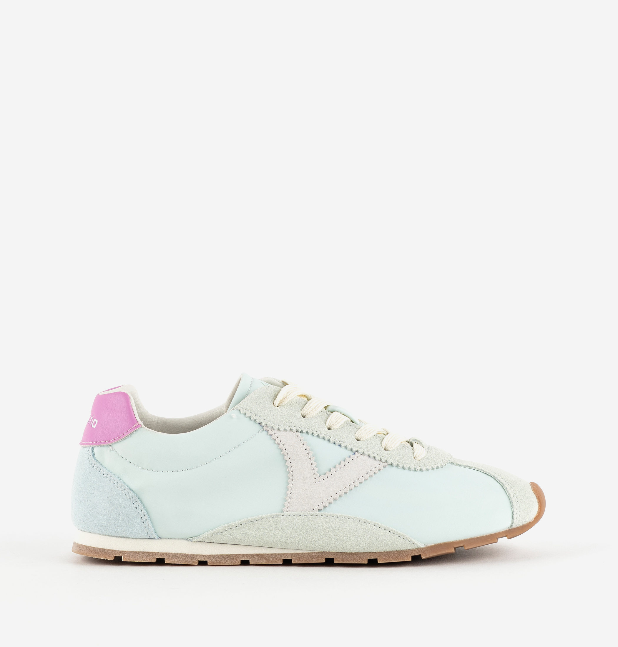 Sneakers para mujer fabricadas en nylon con piezas superpuestas de serraje al tono. Detalle de color en pieza trasera con el grabado de la marca en blanco. Suela de goma con patín dentado de EVA en color caramelo.
