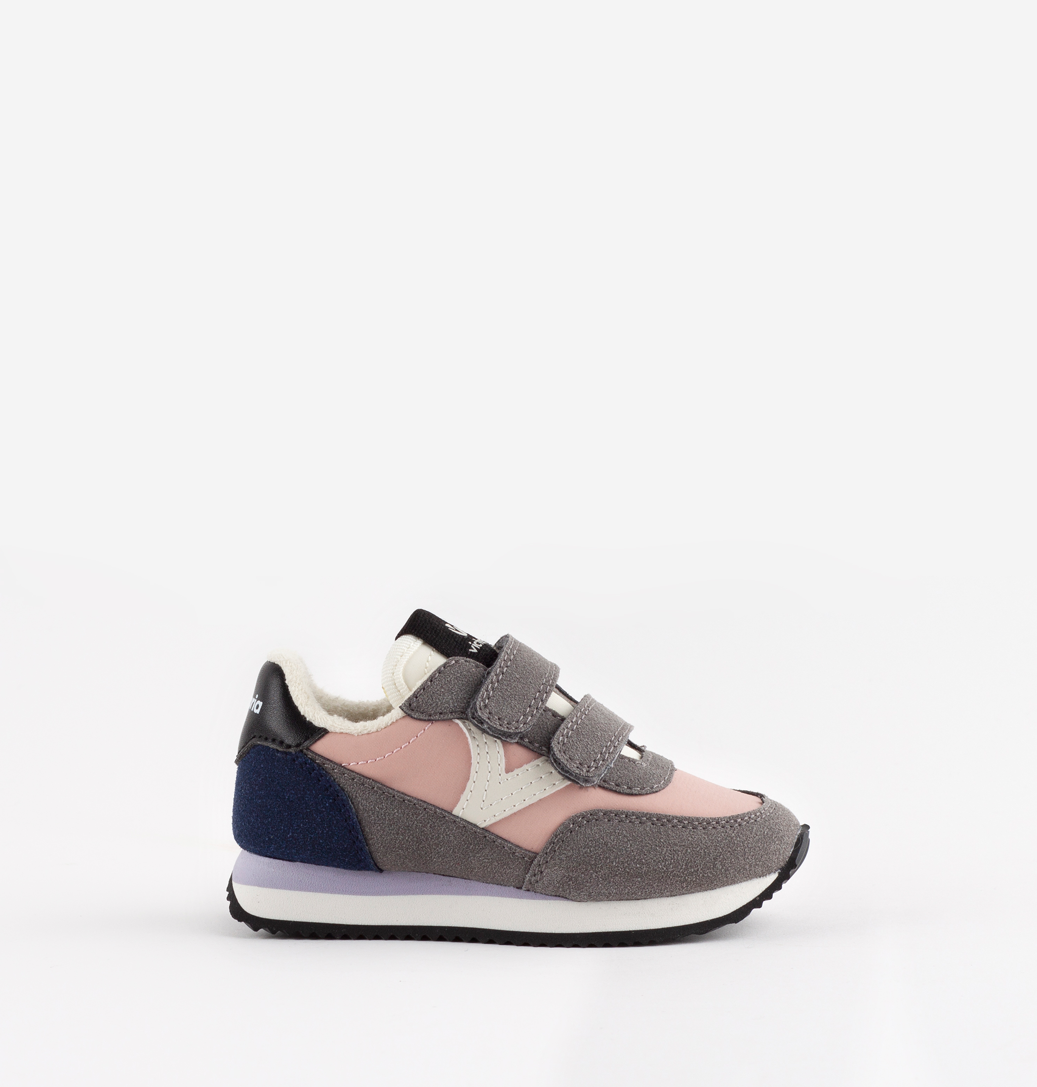 Zapatillas deportivas para niña. Fabricadas en nailon con piezas efecto serraje. V retro blanca en el lateral y detalles de color. Cierre mediante doble tira adherente que fomenta la autonomía y facilita el calce de los más pequeños. Ligeras y cómodas gracias a la suela dentada antideslizante.