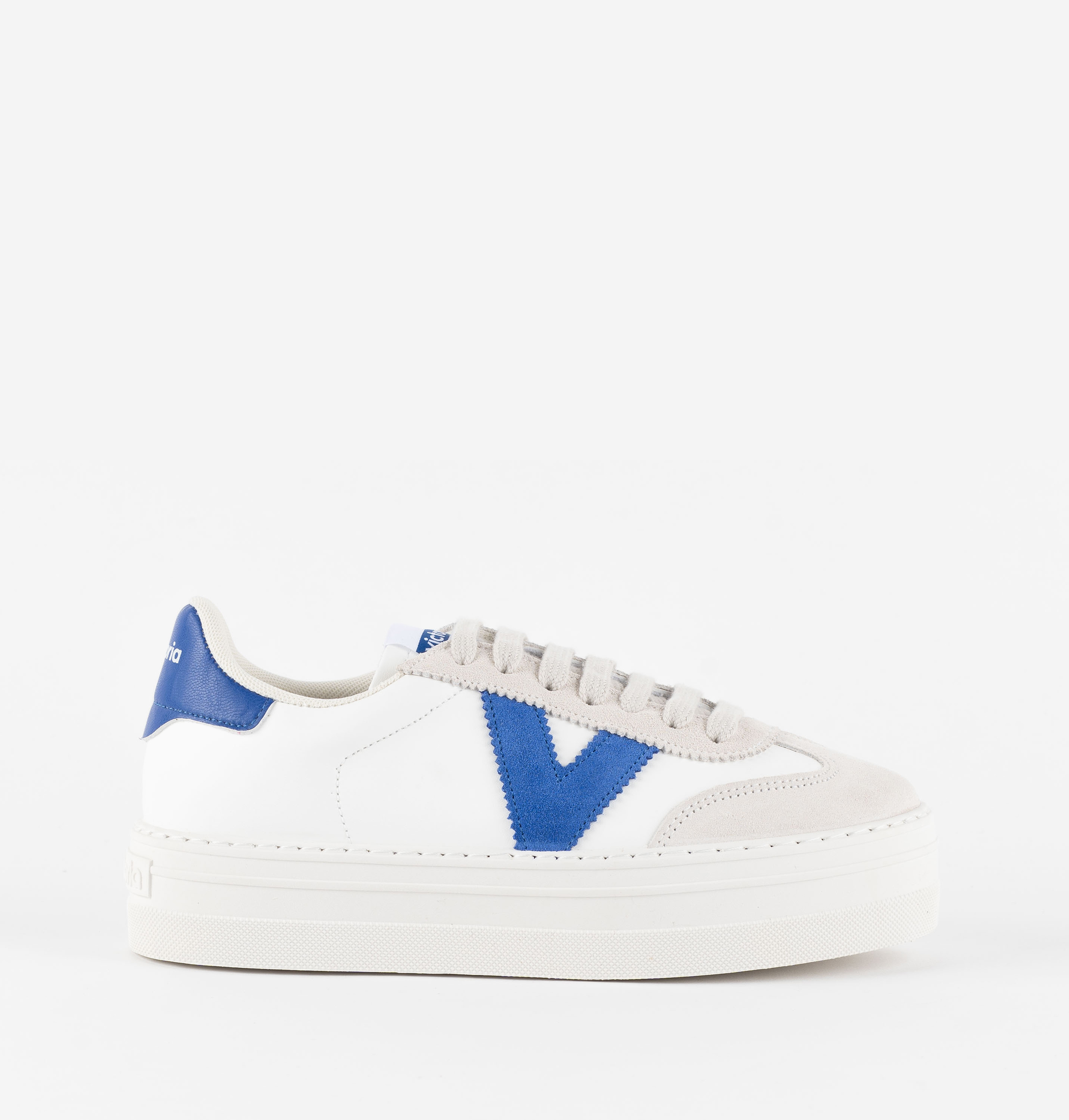 Zapatillas con plataforma para mujer. Fabricadas en España en efecto piel blanca con piezas de serraje (nuevo corte ciclista en la puntera). V de victoria lateral y pieza trasera en colores a juego en contraste. Cómoda suela de PVC de 4 cm elaborada con aceites vegetales en lugar de minerales, reduciendo así el impacto medioambiental.