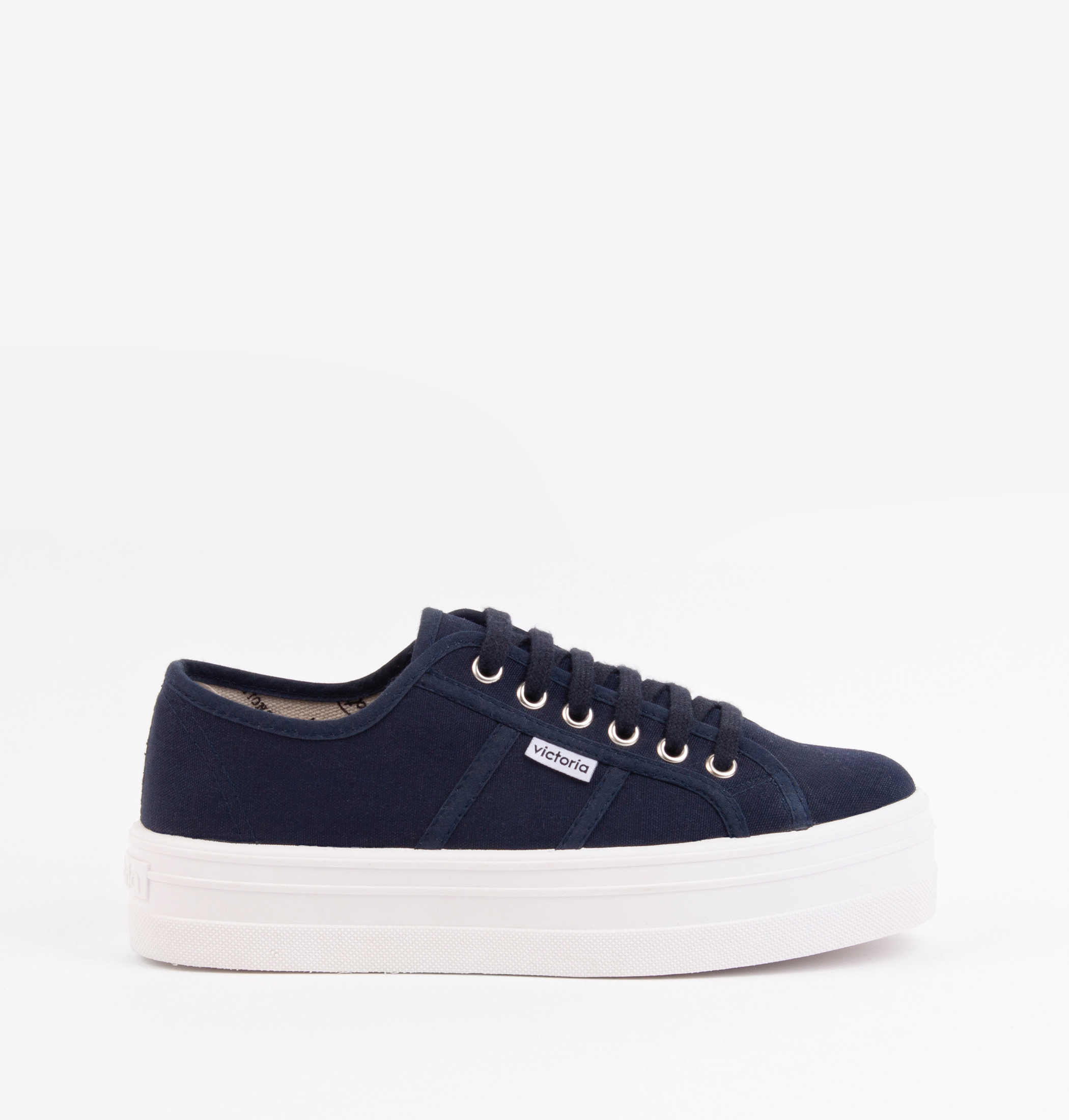 Zapatillas con plataforma para mujer. Fabricadas en España con algodón 100% ecológico de la mejor calidad. Cierre mediante cordones al tono y etiqueta de victoria en el lateral. Suela blanca de 4 cm de plataforma elaborada con aceites vegetales en lugar de minerales en su composición, reduciendo así el impacto medioambiental.