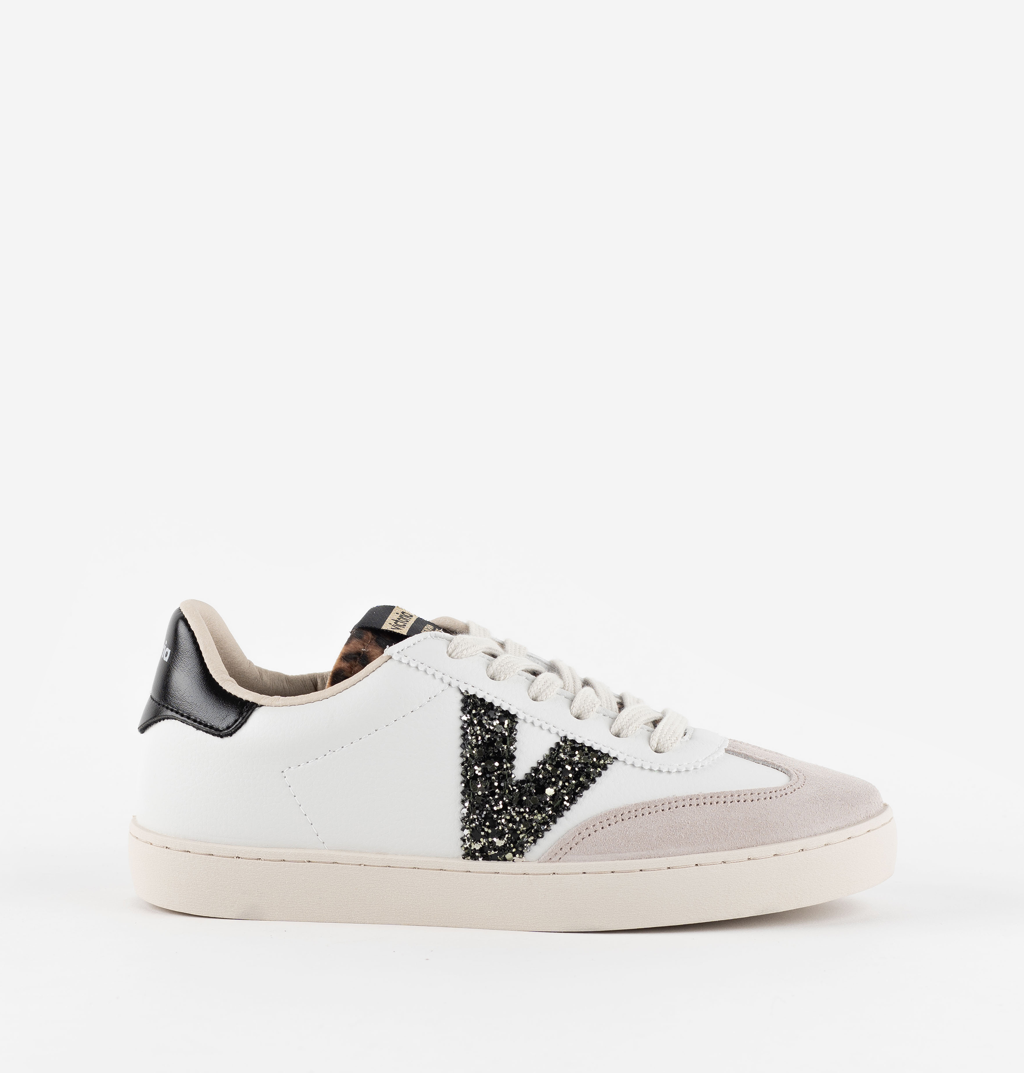 Zapatillas para mujer fabricadas en España en material efecto piel bombeada y puntera de serraje. Glitter con textura en la V lateral, y detalle animal print en la lengüeta. Cierre mediante cordones al tono y nuevo corte ciclista en la puntera. Su suela ligeramente tostada está compuesta por aceites vegetales en lugar de minerales reduciendo así el impacto medioambiental. Además, incluyen una plantilla más ergonómica, confeccionada a partir de materiales reciclados, proporcionando un confort superior en cada paso.