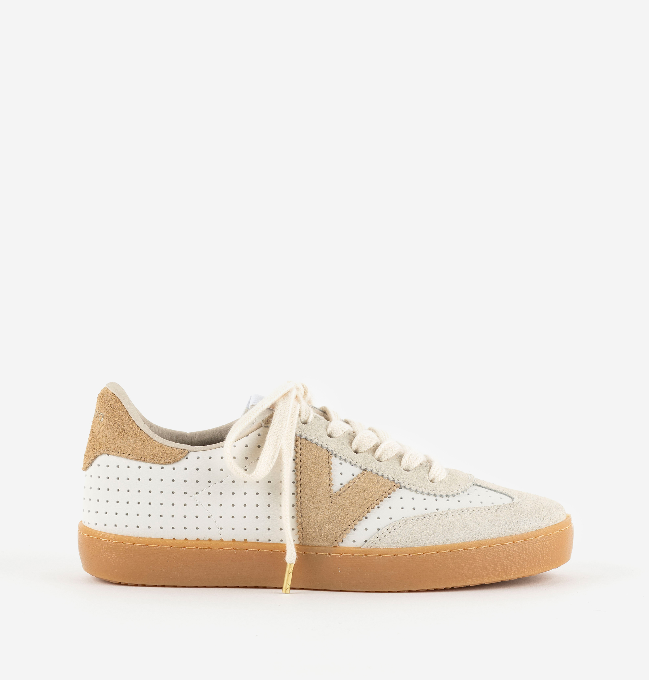 Zapatillas unisex fabricadas en España en efecto piel blanca microperforada con piezas de serraje. V de victoria lateral y pieza trasera en colores a juego en contraste. Suela de T.R. traslúcido color caramelo.