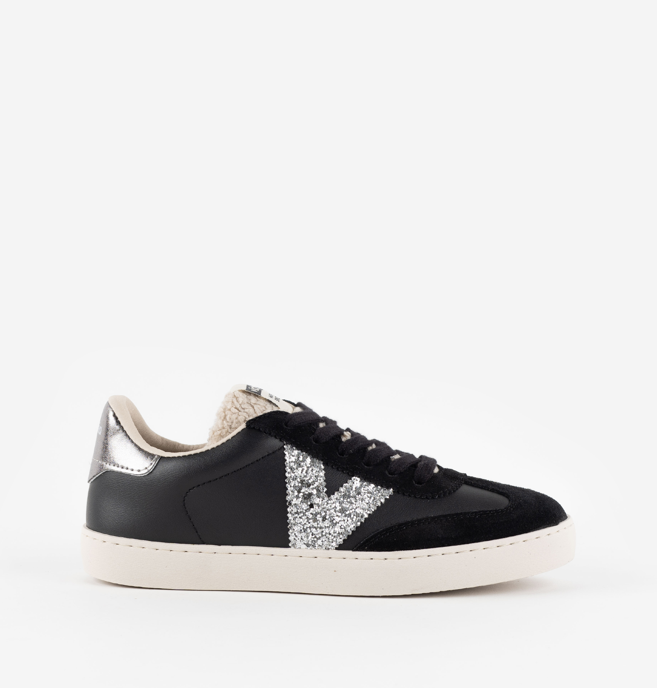 Zapatillas para mujer fabricadas en España en material efecto piel y piezas de serraje. V del lateral con textura en glitter y detalle metalizado en la pieza trasera. Lengüeta en borreguito y nuevo corte ciclista en la puntera aportando estilo. Su suela ligeramente tostada está compuesta por aceites vegetales en lugar de minerales reduciendo así el impacto medioambiental. Además, incluyen una plantilla más ergonómica, confeccionada a partir de materiales reciclados, proporcionando un confort superior en cada paso.