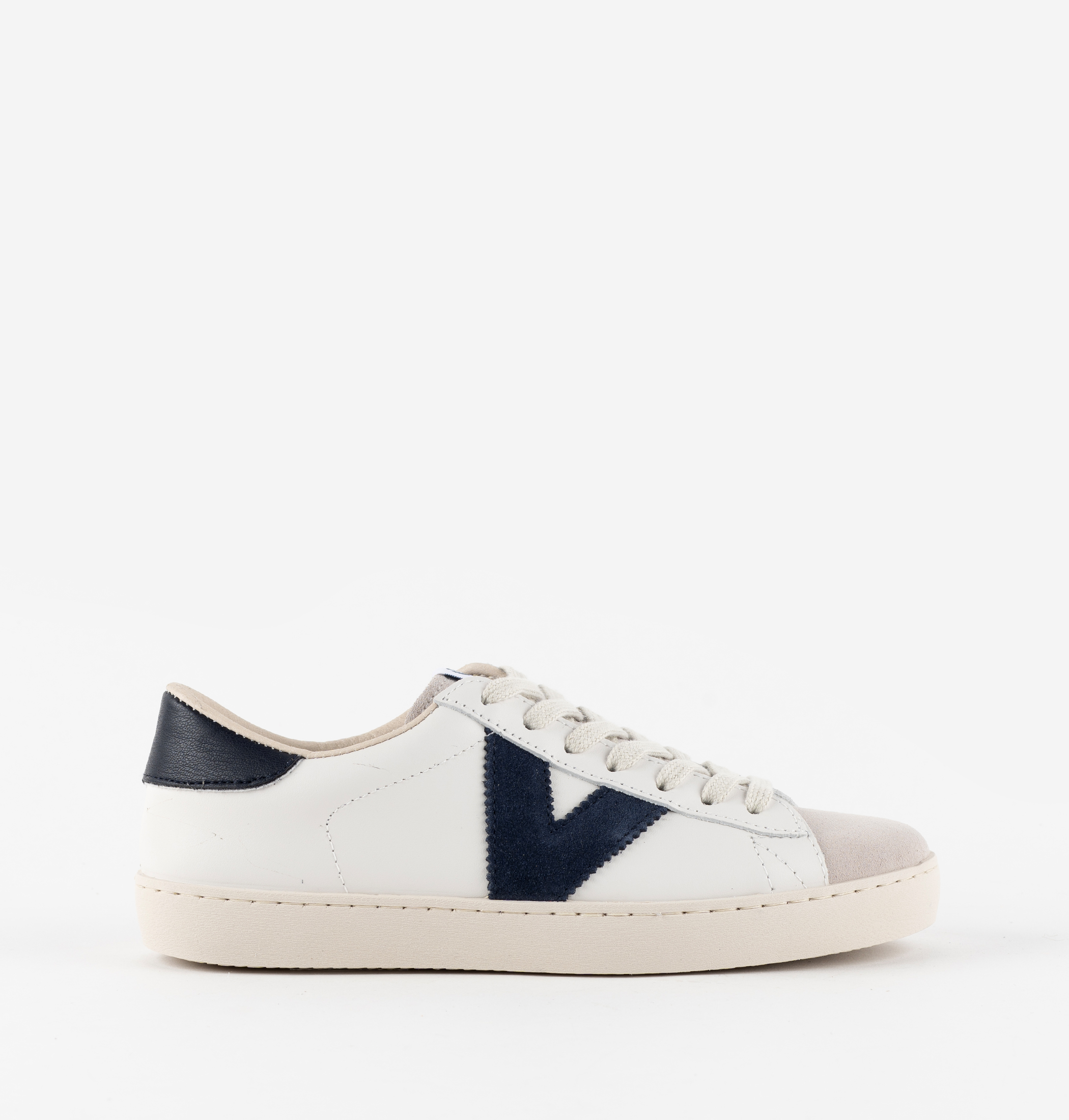 Zapatillas blancas unisex fabricadas en España en piel suave de alta calidad. V de victoria lateral y pieza trasera en colores a juego en contraste. Puntera en serraje. Suela de PVC ligeramente tostada elaborada con aceites vegetales en lugar de minerales, reduciendo así el impacto medioambiental.