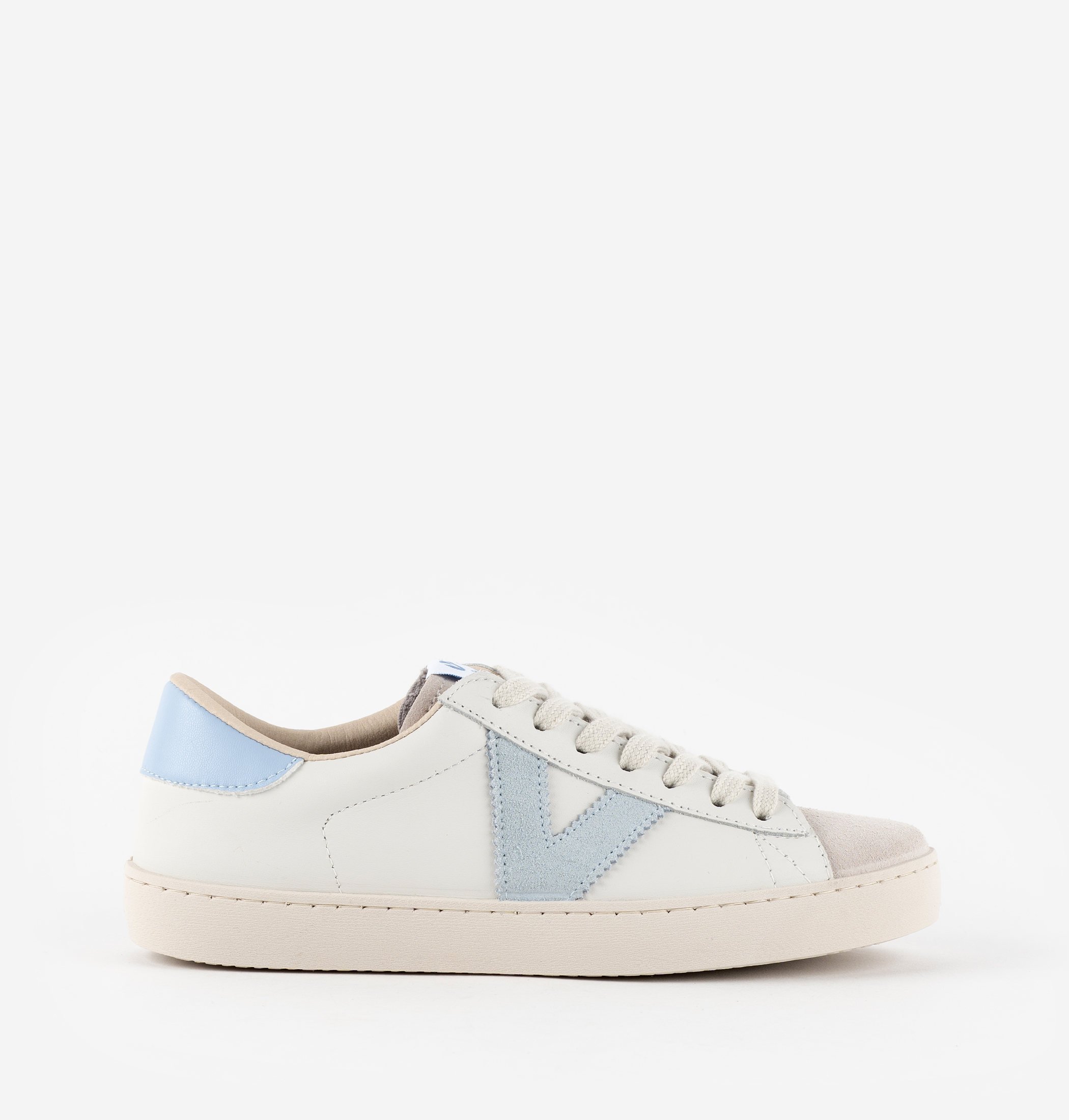 Zapatillas blancas unisex fabricadas en España en piel suave de alta calidad. V de victoria lateral y pieza trasera en colores a juego en contraste. Puntera en serraje. Suela de PVC ligeramente tostada elaborada con aceites vegetales en lugar de minerales, reduciendo así el impacto medioambiental.