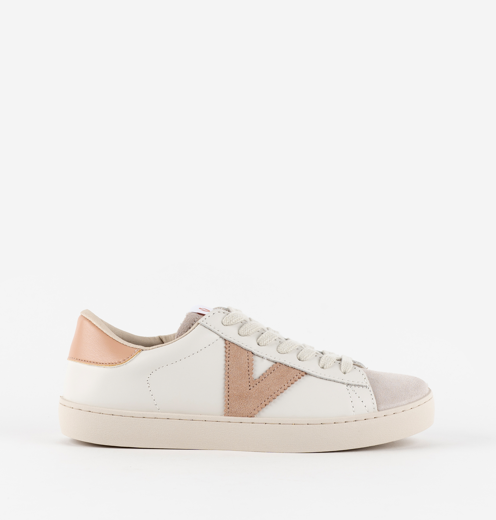 Zapatillas blancas unisex fabricadas en España en piel suave de alta calidad. V de victoria lateral y pieza trasera en colores a juego en contraste. Puntera en serraje. Suela de PVC ligeramente tostada elaborada con aceites vegetales en lugar de minerales, reduciendo así el impacto medioambiental.