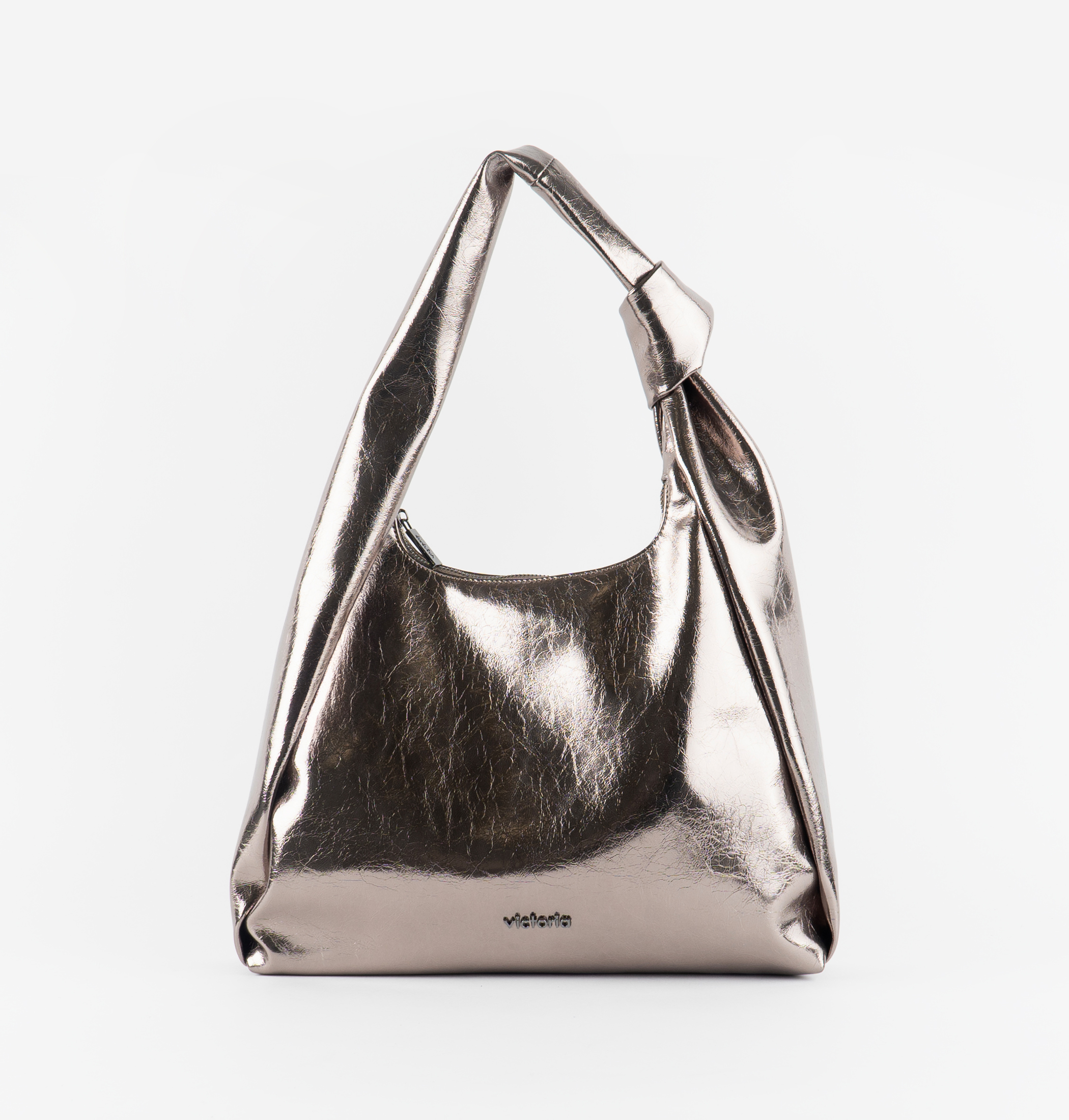 Bolso metalizado con asas de hombro con detalle nudo. Cierre de cremallera con tirador metálico personalizado. Cuenta con doble bolsillo interior, uno de los cuales también se cierra con cremallera. Forro interior al tono. Chapita de marca exterior metálica.