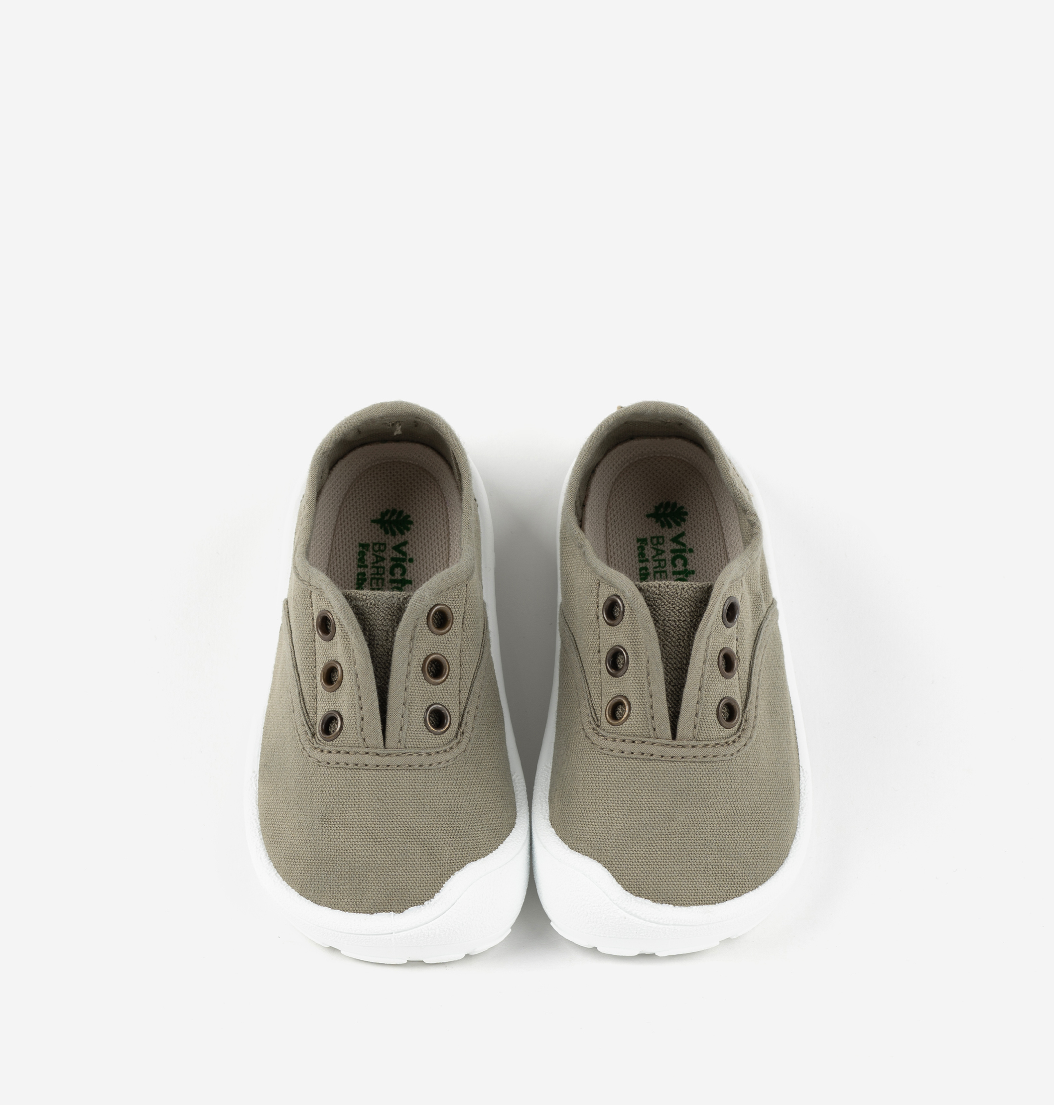 Zapatillas de lona barefoot para niños fabricadas en una combinación de algodón reciclado DREC® (Dyeable Recycled Eco Cotton) y algodón ecológico cultivado, hilado y tejido en España. Incorporan un elástico suave en el empeine, que aporta sujección y facilita el calce, fomentando su autonomía. Suela blanca de TR Flexible.