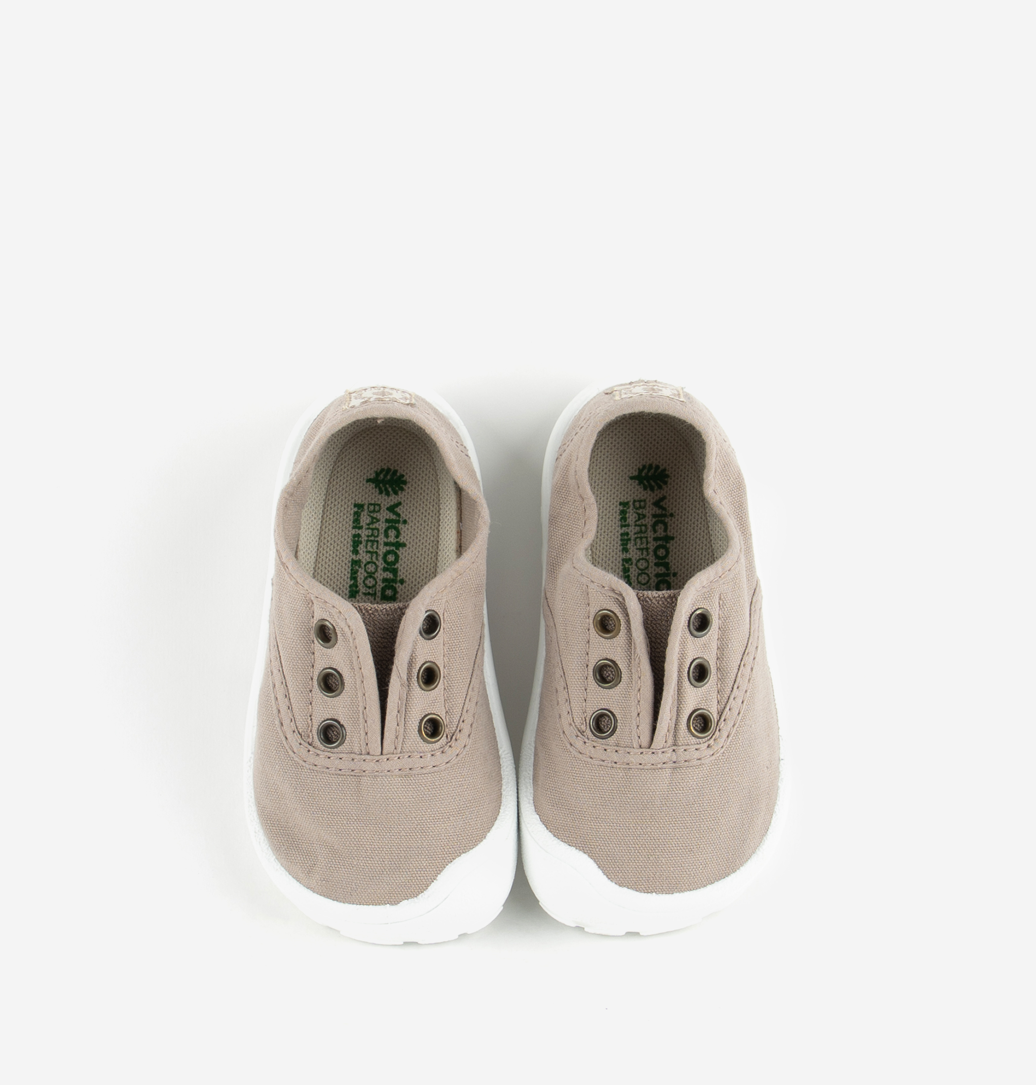 Zapatillas de lona barefoot para niños fabricadas en una combinación de algodón reciclado DREC® (Dyeable Recycled Eco Cotton) y algodón ecológico cultivado, hilado y tejido en España. Incorporan un elástico suave en el empeine, que aporta sujección y facilita el calce, fomentando su autonomía. Suela blanca de TR Flexible.