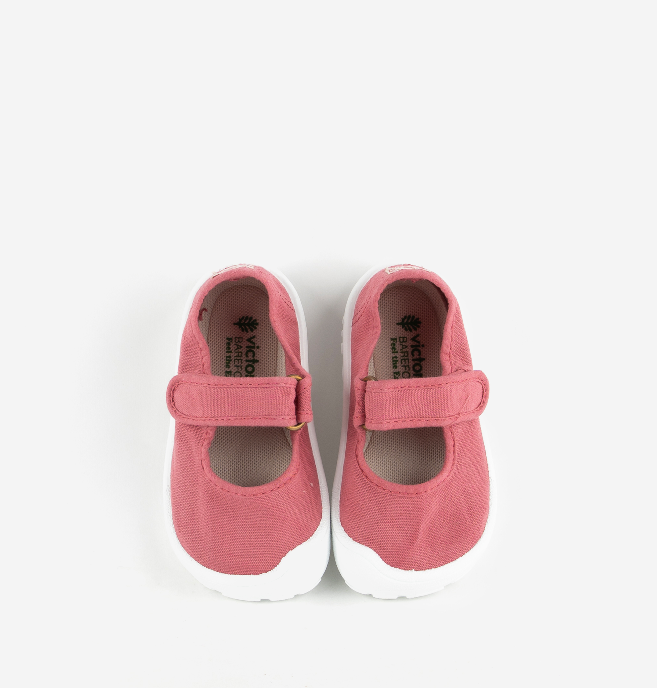 Merceditas de lona barefoot para niños fabricadas en una combinación de algodón reciclado DREC® (Dyeable Recycled Eco Cotton) y algodón ecológico cultivado, hilado y tejido en España. Cierre con tira adherente para un ajuste fácil y seguro. Suela blanca de TR Flexible.