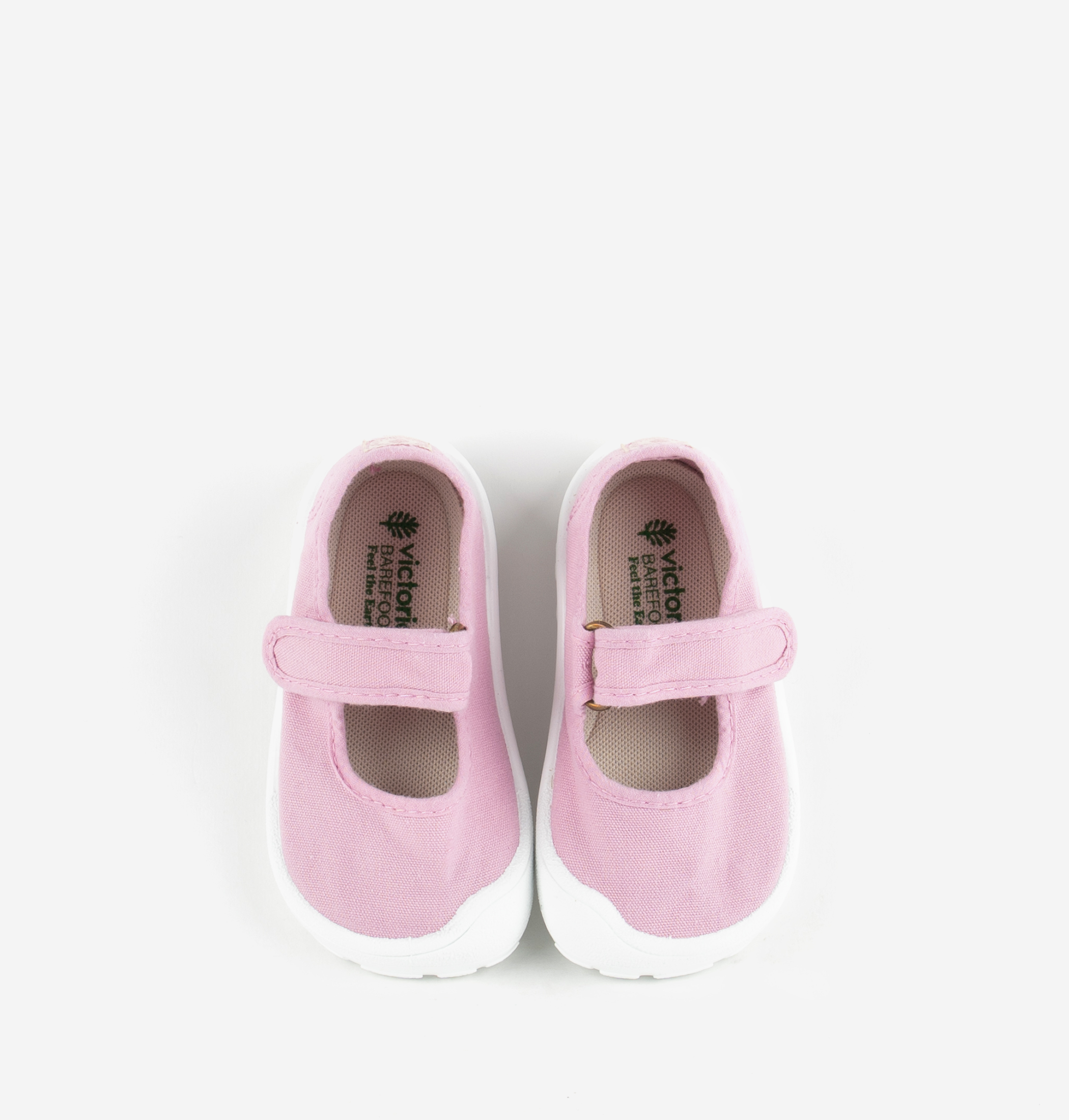Merceditas de lona barefoot para niños fabricadas en una combinación de algodón reciclado DREC® (Dyeable Recycled Eco Cotton) y algodón ecológico cultivado, hilado y tejido en España. Cierre con tira adherente para un ajuste fácil y seguro. Suela blanca de TR Flexible.