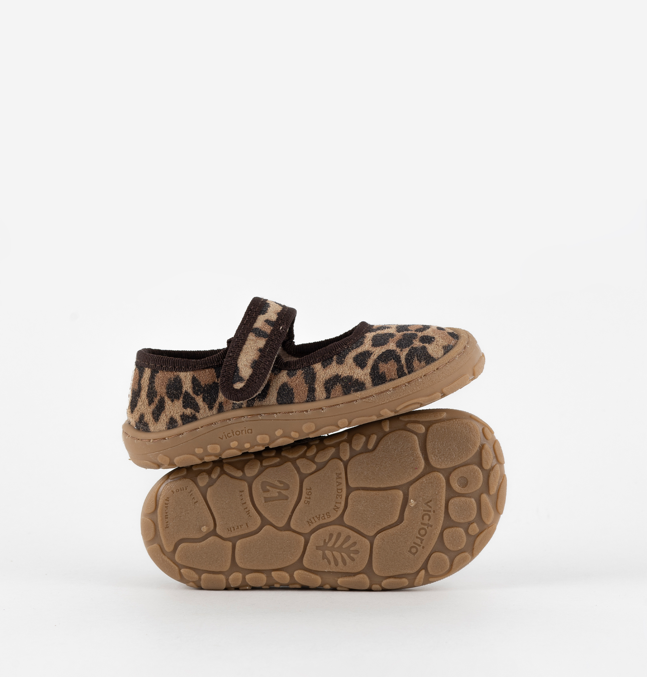 Estampado de leopardo con ribete en contraste. Cierre con tira adherente que facilita el calce y aporta sujección. Suela flexible en color caramelo.