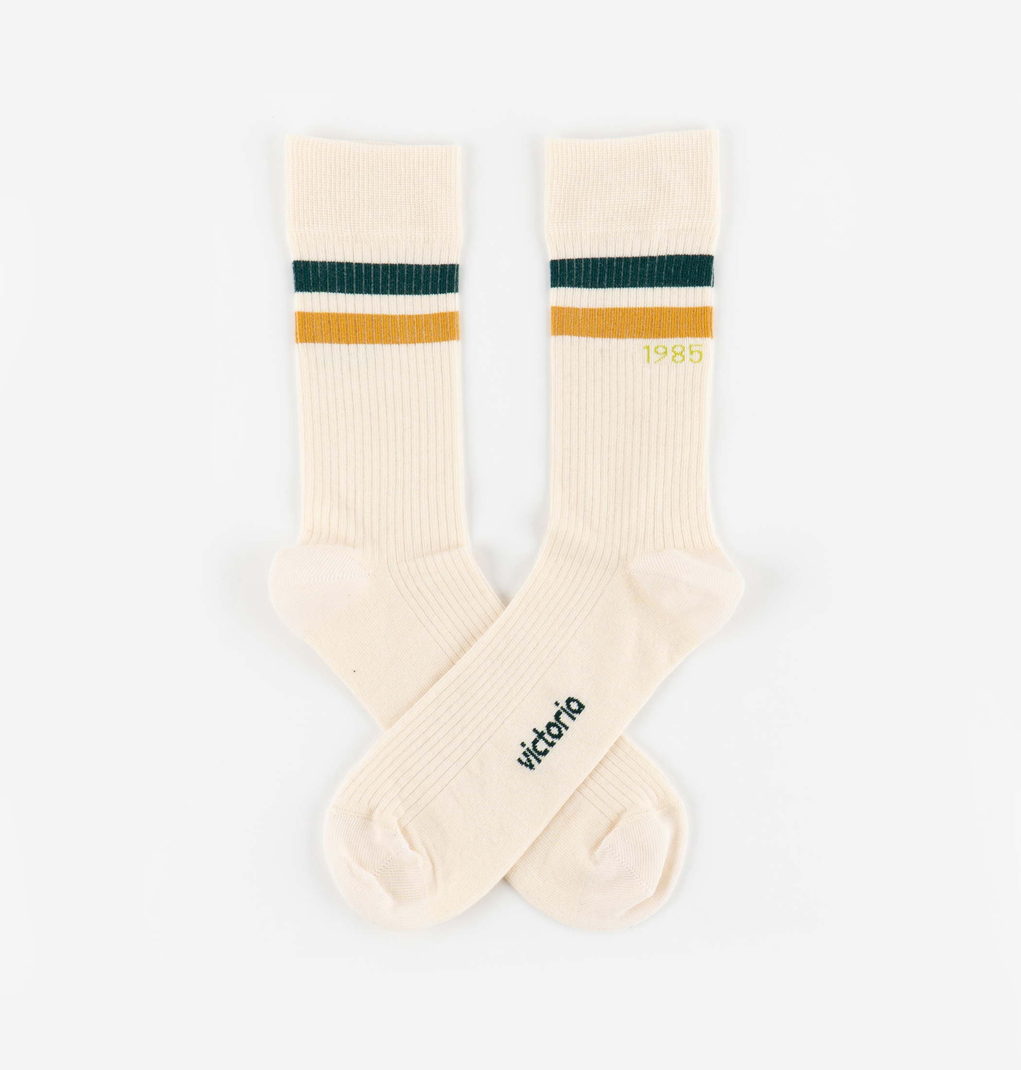 Calcetín de algodón con detalle de rayas y bordado 1985. Perfecto para combinar con nuestras sneakers.