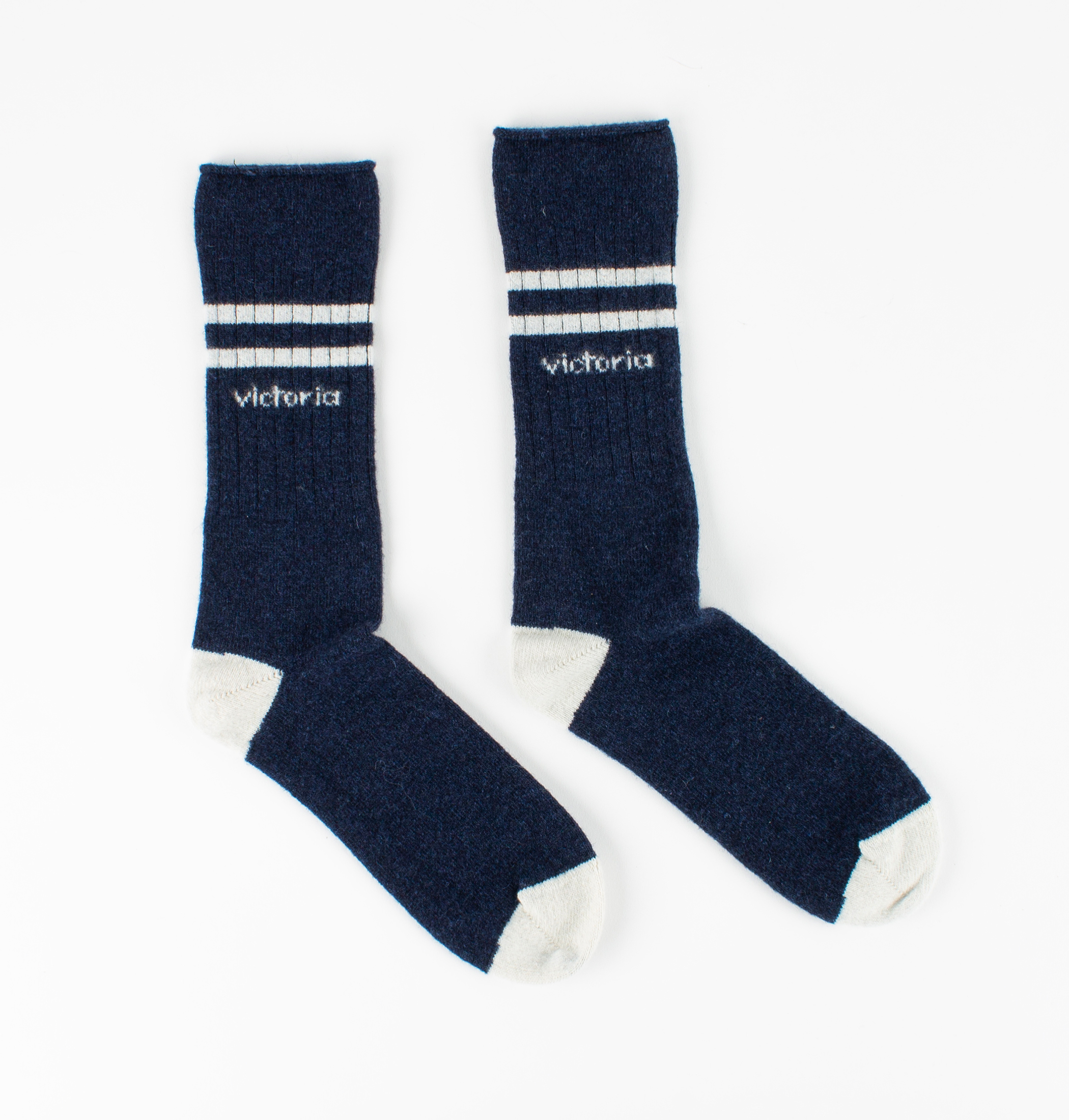 Calcetín de lana alto, muy cálido y confortable para los días fríos de invierno, con detalle de dos rayitas superiores y talón en blanco roto que combina la tradición de la lana con un diseño muy actual.