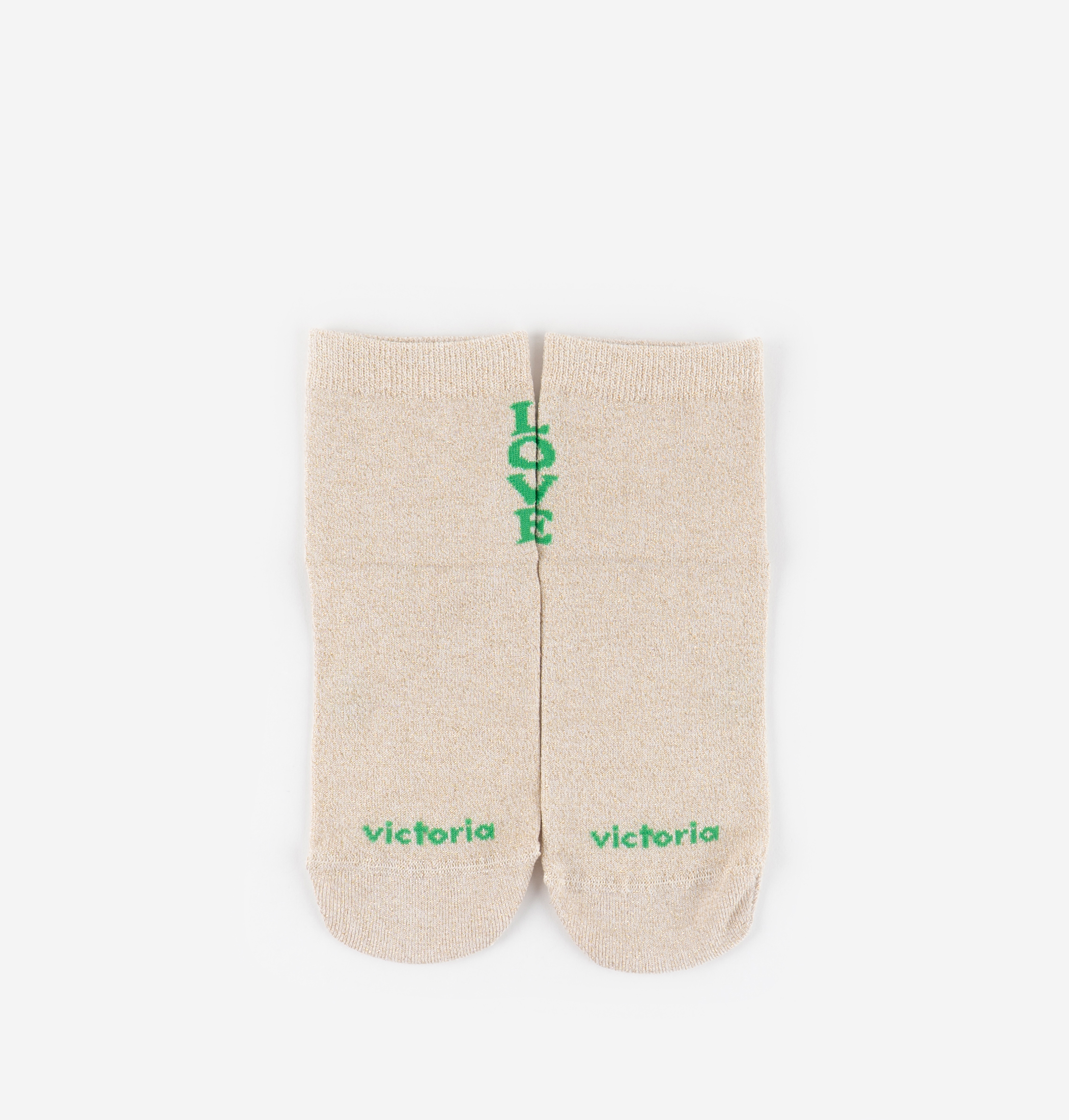 Calcetín barefoot lurex para mujer con bordado love y de la marca a juego en la planta. Perfecto para combinar con nuestras zapatillas.