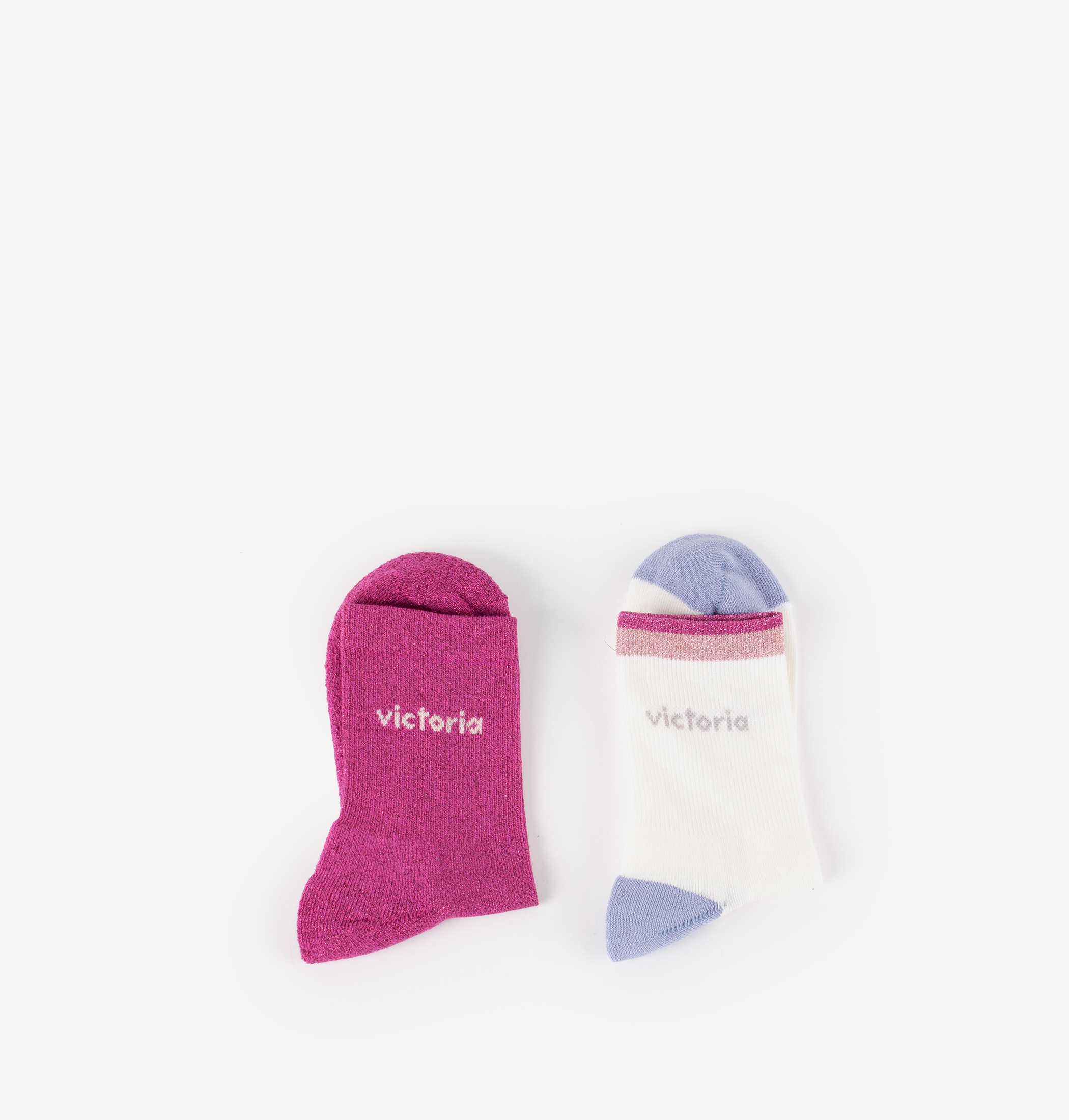 Pack de 2 pares de calcetines altos para mujer fabricados en España. Hilos con una combinación de colores de algodón con detalles en lurex. Tejidos con efecto canalé. Planta interior en rizo, que lo hace más cálido y confortable.