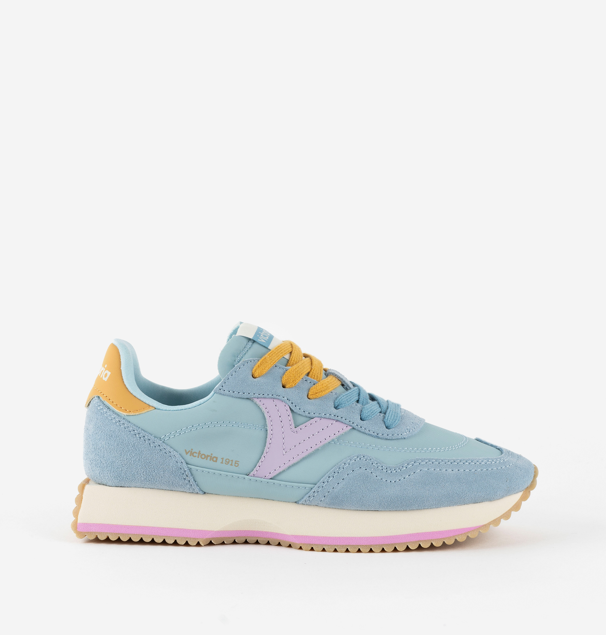 Sneakers multicolor para mujer fabricadas en nylon con piezas de serraje superpuestas al tono. V de victoria lateral y pieza trasera en colores efecto piel. Cierre mediante doble cordón: unos al tono, y otros a juego con la pieza trasera. Suela bicolor de EVA con patín dentado de goma color caramelo.