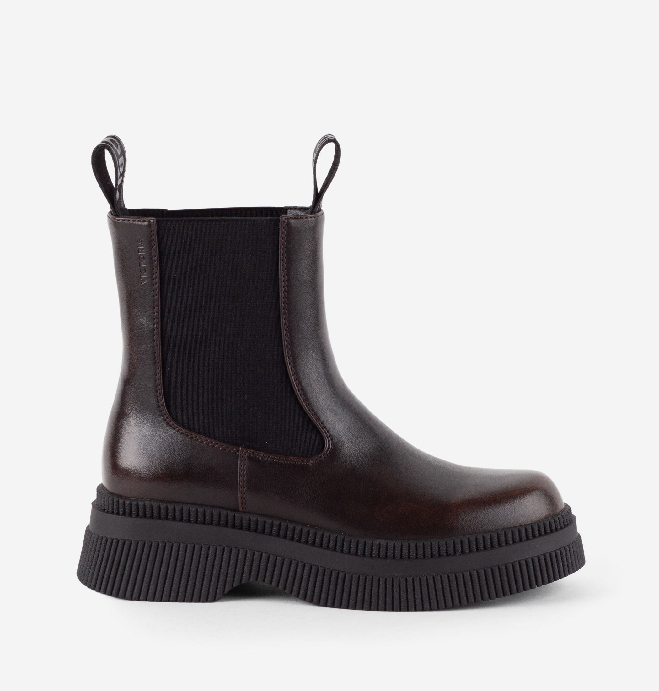 Botas de estilo Chelsea para mujer, fabricadas en material efecto piel con un acabado brillante y una suela de 5 cm de altura adornada con motivos de rayas. Estas botas forman parte de la nueva línea Victoria Capital, una colección urbana y cosmopolita inspirada en las principales capitales europeas. Son extremadamente cómodas y fáciles de calzar gracias a sus dos tiradores y elásticos centrales, asegurando un estilo elegante y funcional para tu día a día.