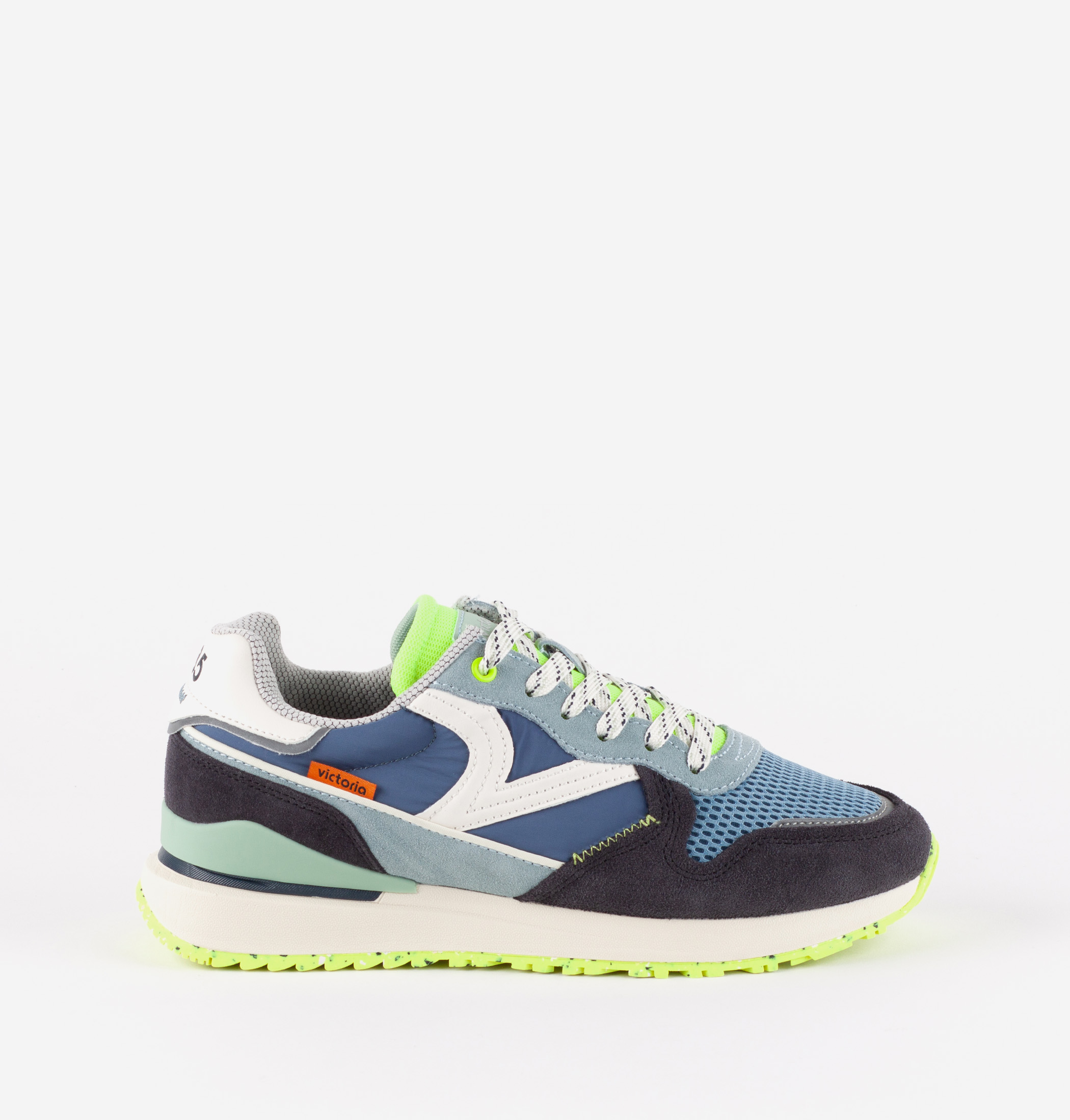 Sneakers para hombre fabricadas en nailon y piezas de serraje y efecto piel. Acabado textil de rejilla en el empeine y lengüeta. V retro en el lateral y detalles en neón. Pieza en la trasera y doble estabilizador en el talón. Patín de goma en relieve y estampado moteado ya que contiene materiales reciclados en su composición. Además, incluyen plantilla ergonómica que se adapta a la forma del pie y regala la sensación de comodidad.