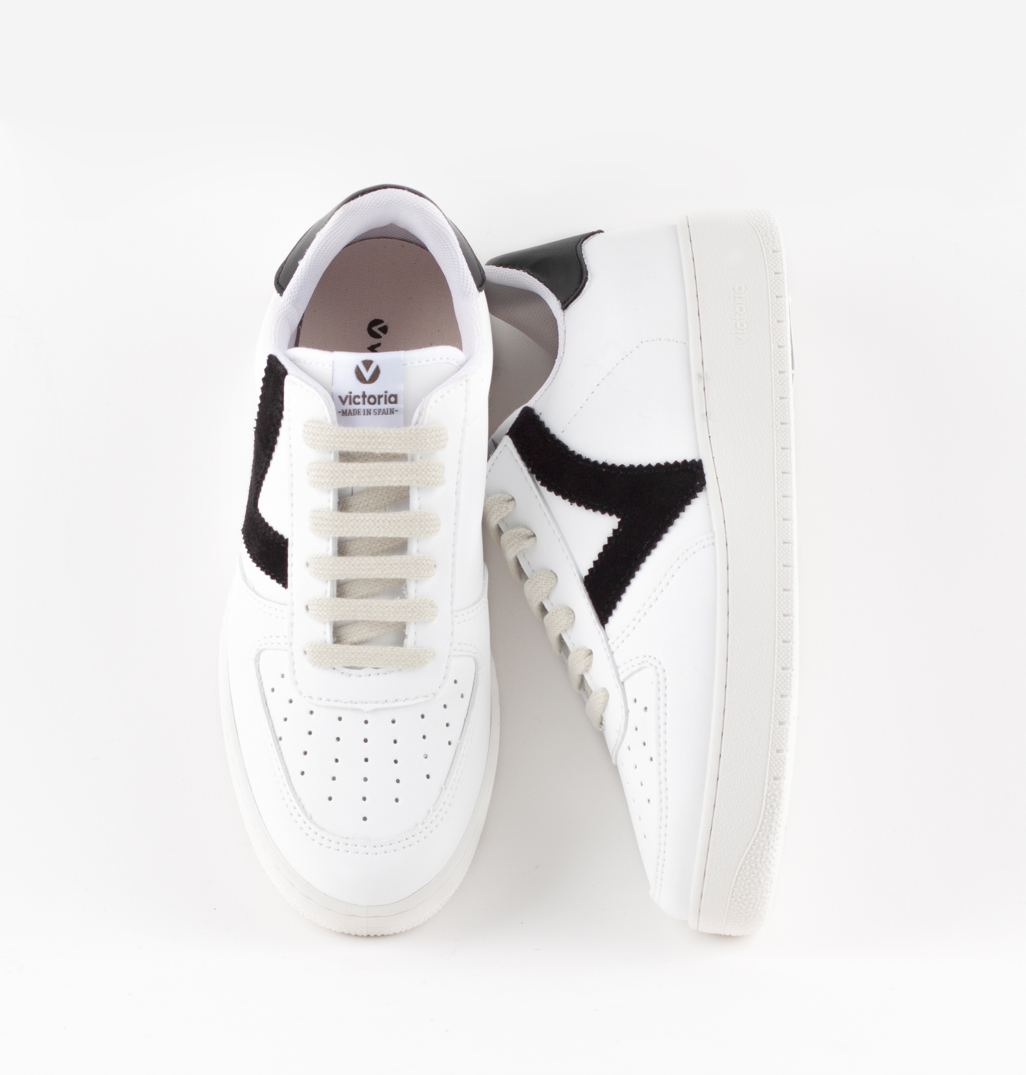 Zapatillas deportivas unisex fabricadas en España en efecto piel blanca. Detalles de color en la V de victoria lateral y la pieza trasera. Puntera perforada para favorecer la transpiración. Suela de PVC con relleno reciclado.