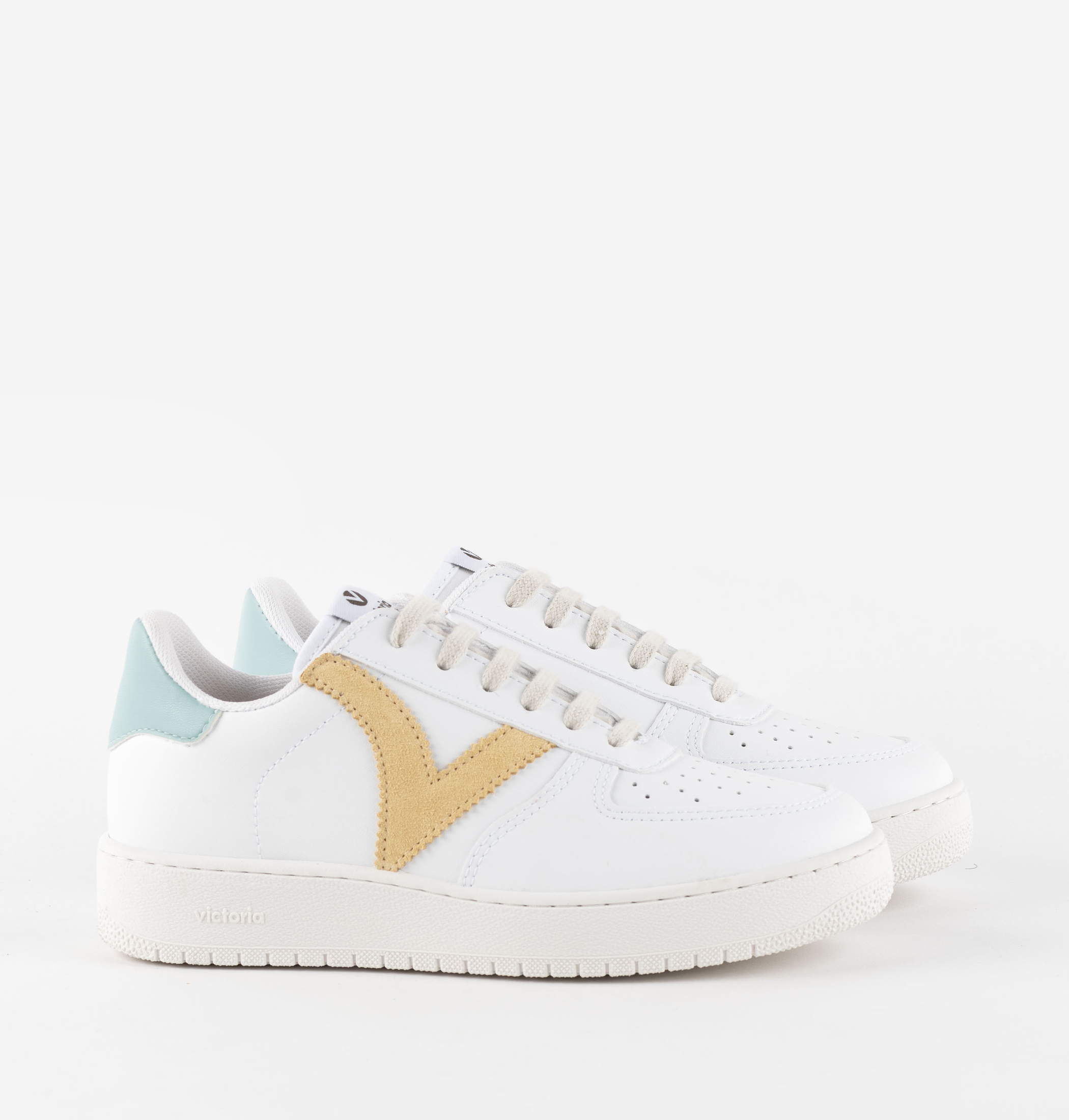 Zapatillas deportivas unisex fabricadas en España en efecto piel blanca. Detalles de color en la V de victoria lateral y la pieza trasera. Puntera perforada para favorecer la transpiración. Suela de PVC con relleno reciclado.