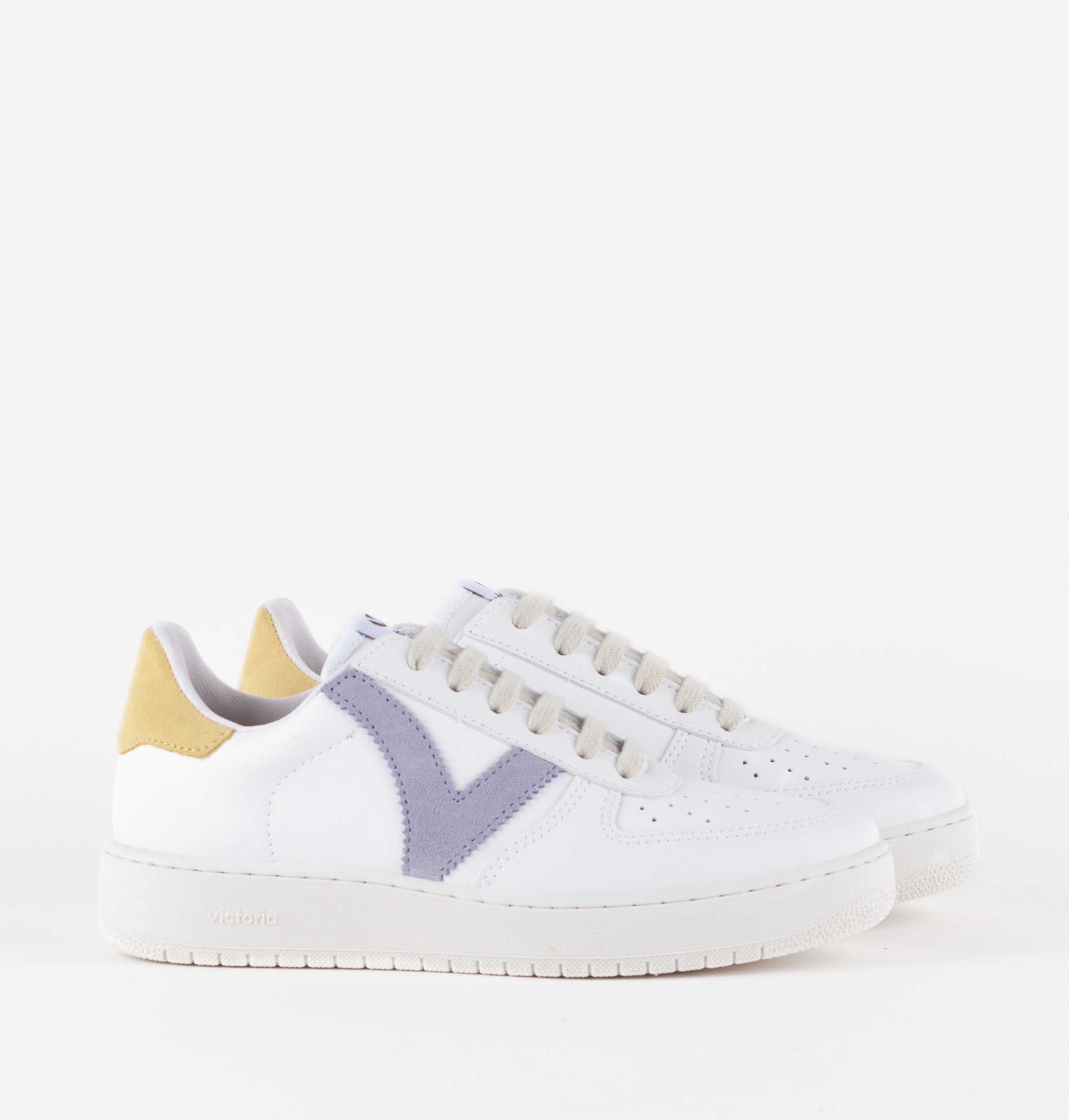 Zapatillas deportivas blancas unisex fabricadas en España en material efecto piel. Detalle de color en la V lateral y la pieza trasera. Suela de 3 cm compuesta por aceites vegetales en lugar de minerales reduciendo así el impacto medioambiental. Ligeras, cómodas y transpirables.