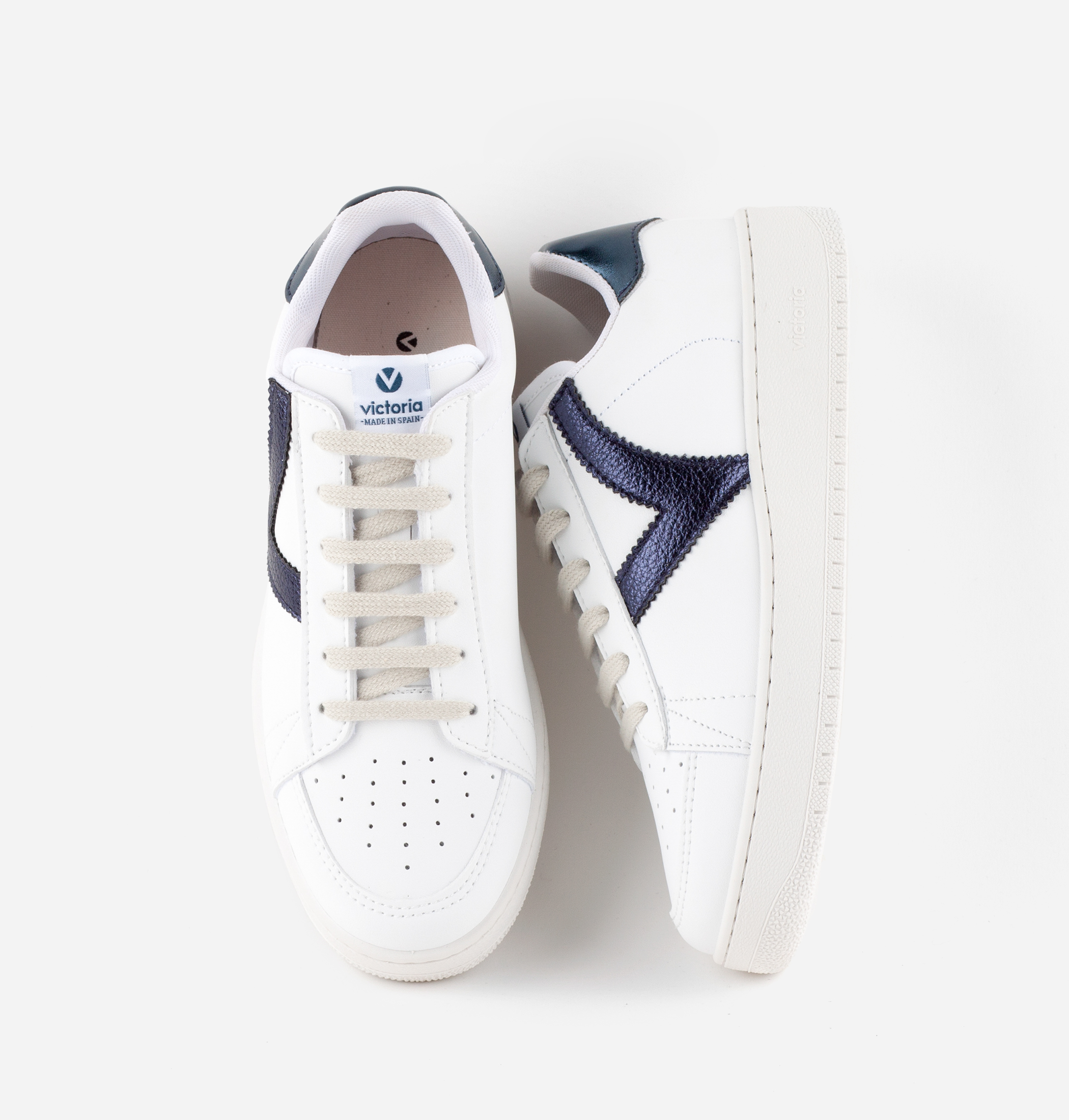 Zapatillas deportivas blancas para mujer fabricadas en España en material efecto piel. Detalle metalizado en la V lateral y la pieza trasera. Suela de 3 cm compuesta por aceites vegetales en lugar de minerales reduciendo así el impacto medioambiental. Ligeras, cómodas y transpirables.