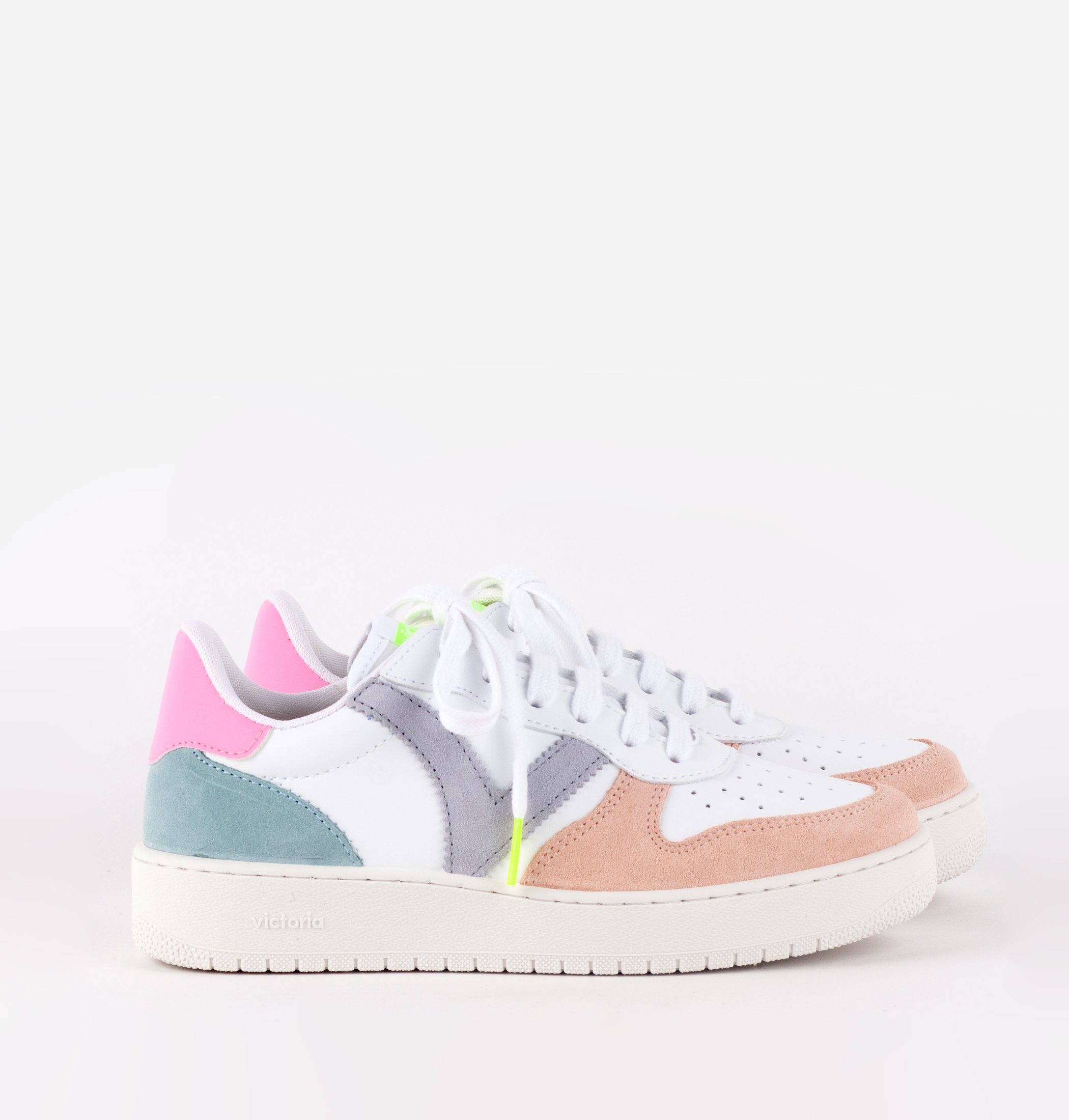 Zapatillas deportivas multicolor para mujer fabricadas en España en efecto piel blanca con piezas de serraje. Cierre mediante cordones blancos con cabetes en tonos flúor. Puntera perforada para favorecer la transpiración. Suela de PVC con relleno reciclado.