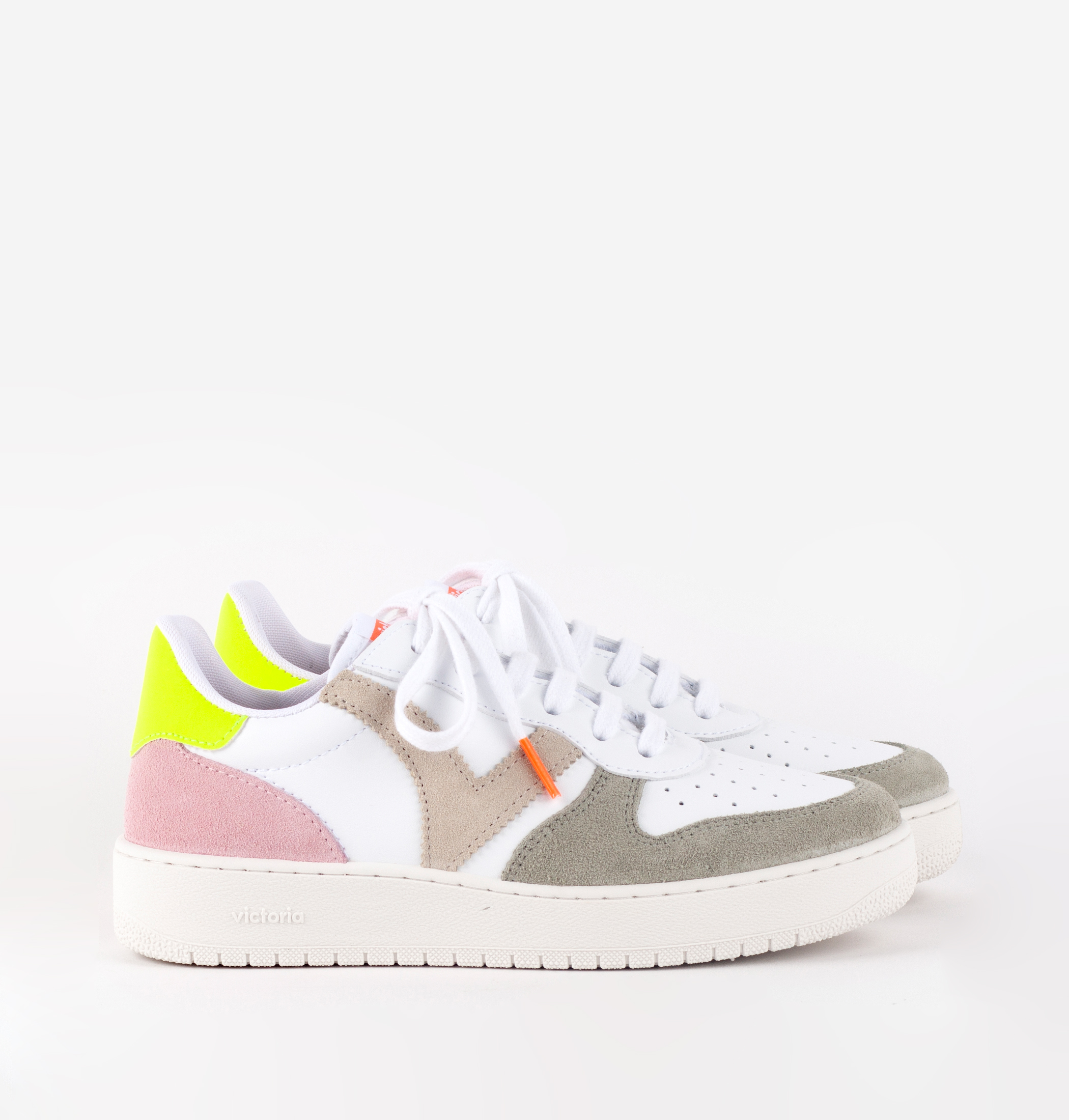 Zapatillas deportivas multicolor para mujer fabricadas en España en efecto piel blanca con piezas de serraje. Cierre mediante cordones blancos con cabetes en tonos flúor. Puntera perforada para favorecer la transpiración. Suela de PVC con relleno reciclado.