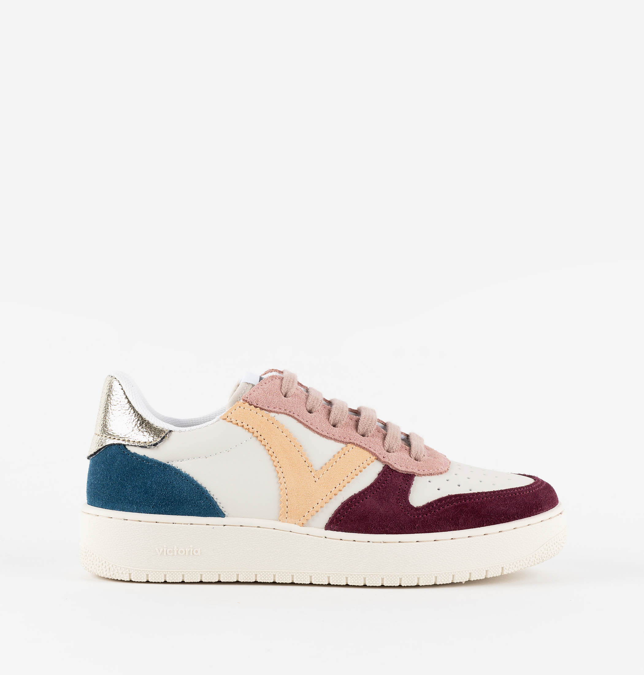 Zapatillas para mujer fabricadas en España en material efecto piel y piezas de serraje multicolor. V retro en el lateral y detalle metalizado en la pieza trasera. Suela de 3 cm compuesta por aceites vegetales en lugar de minerales reduciendo así el impacto medioambiental. Ligeras, cómodas y transpirables.