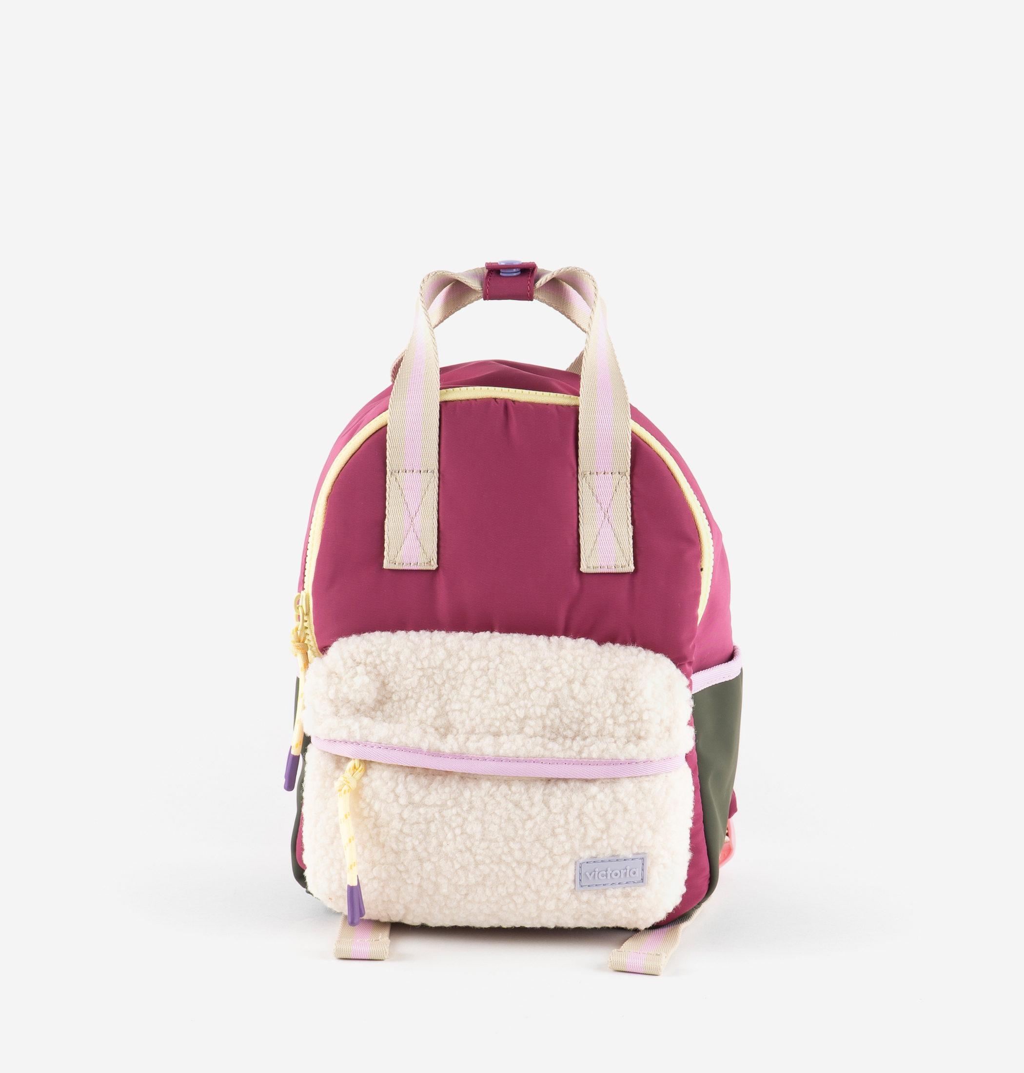 Mochila infantil en tejido de nylon multicolor. Apertura con cierre de cremallera y tirador de cordón. Interior forrado con bolsillos. Presenta un bolsillo exterior delantero de gran capacidad, también con cierre de cremallera y tirador de cordón, y dos bosillos laterales. Forro interior al tono. Asas bicolores y tiras ajustables, reforzadas y con pieza de seguridad.