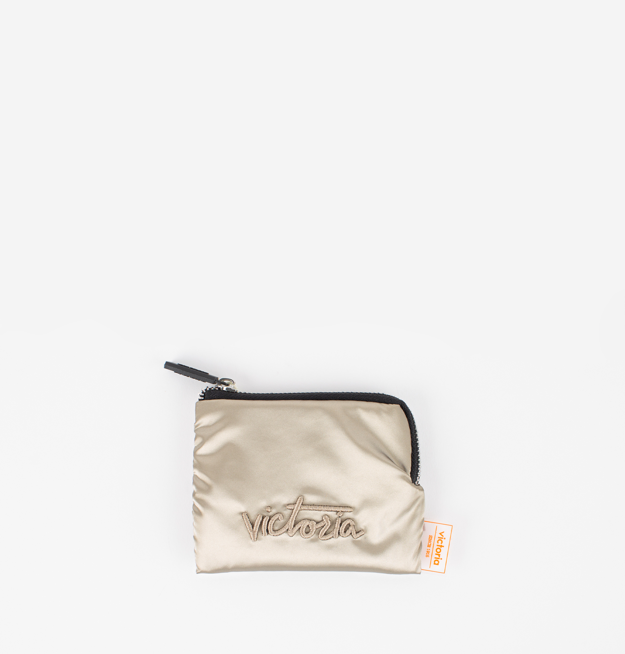 Monedero con amplia apertura mediante cremallera y tirador personalizado, equipado con dos compartimentos interiores para tarjetas. Confeccionado en un tejido metalizado y acolchado, resalta por su bordado en relieve al tono y una etiqueta fluorescente para un toque moderno.