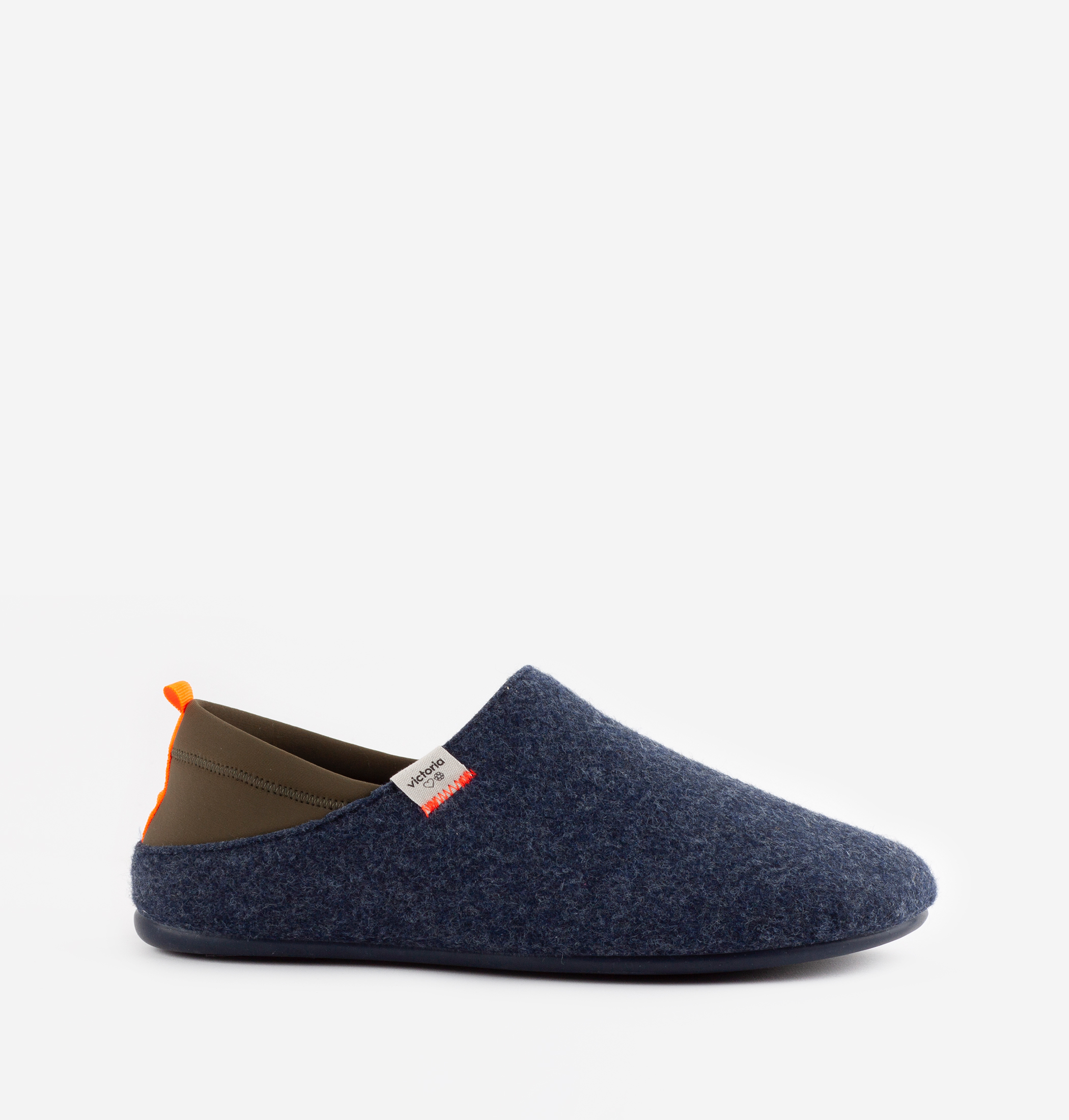 Zapatillas de casa para mujer y hombre fabricadas en España en fieltro reciclado. Trasera de neopreno con tirador en contraste, que permite llevarlas calzadas o en modo destalonado.