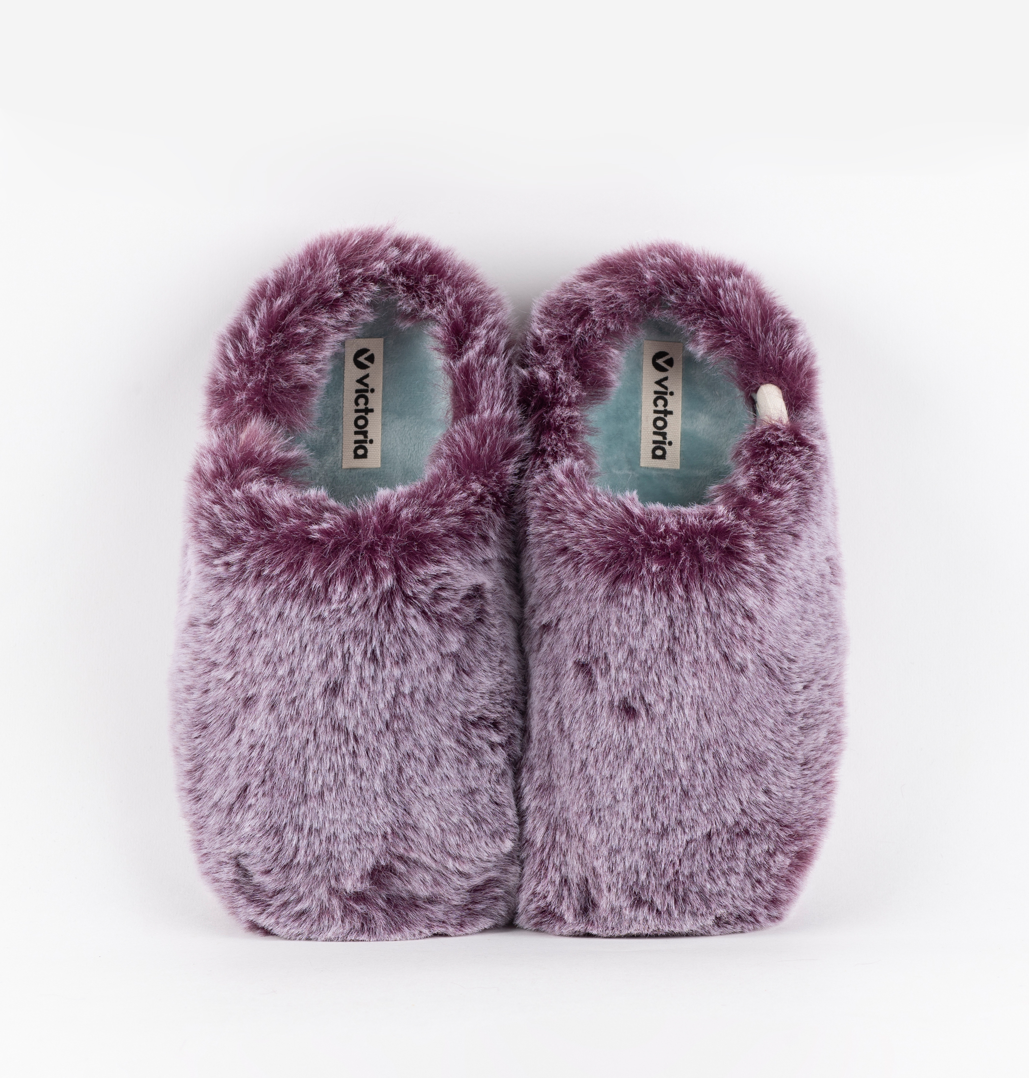 Zapatillas de casa abiertas para mujer fabricadas en España en pelo premium. Etiqueta lateral de victoria. Presentan una plantilla interior recubierta también de pelo en contraste que aporta confort y calidez. Cómoda suela de caucho vulcanizado.