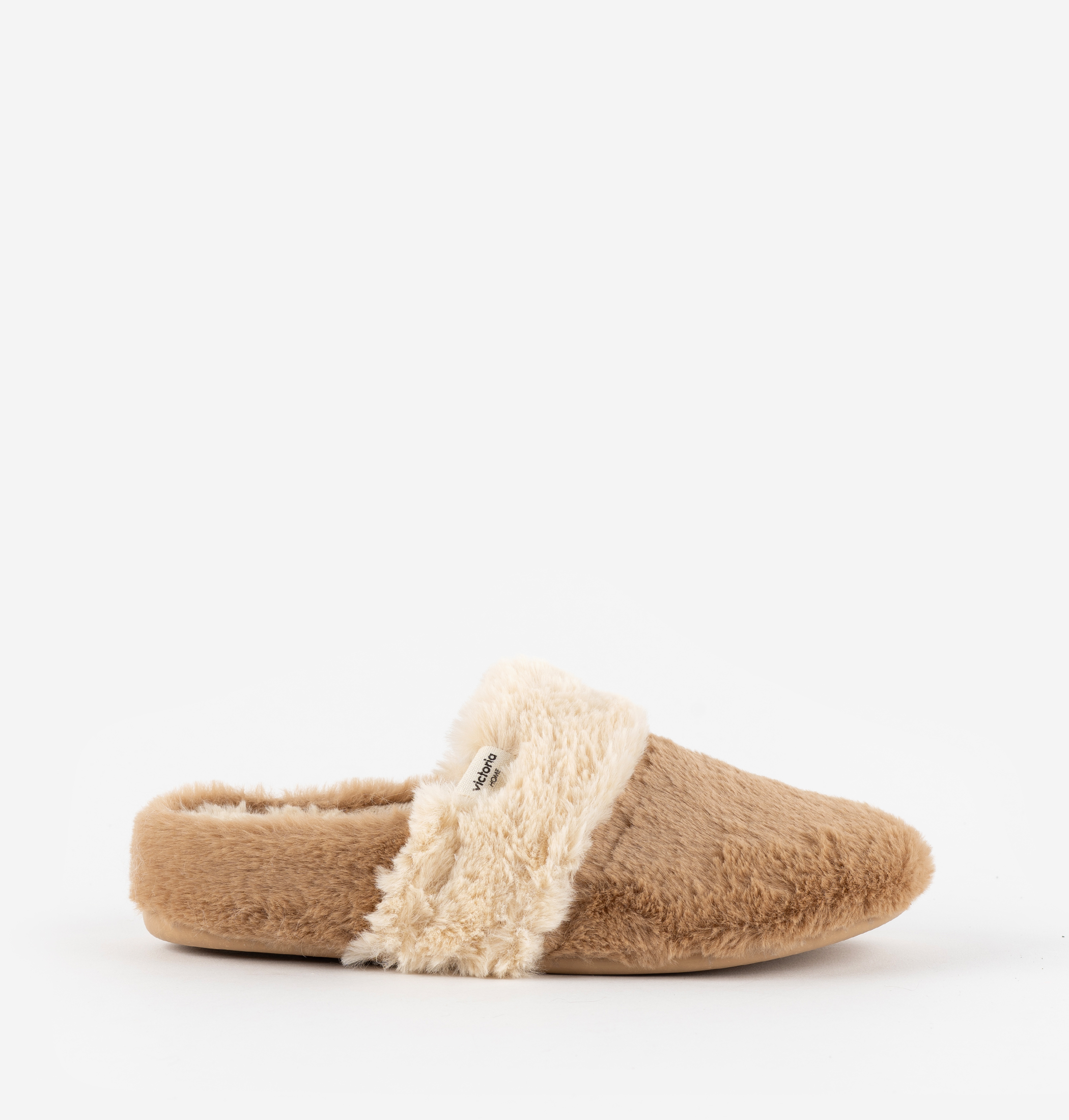 Zapatillas de casa abiertas para mujer fabricadas en España en pelo suave natural. Forro vuelto en contraste con etiqueta de victoria. Presentan una plantilla interior recubierta también de pelo que aporta confort y calidez. Cómoda suela de caucho vulcanizado.