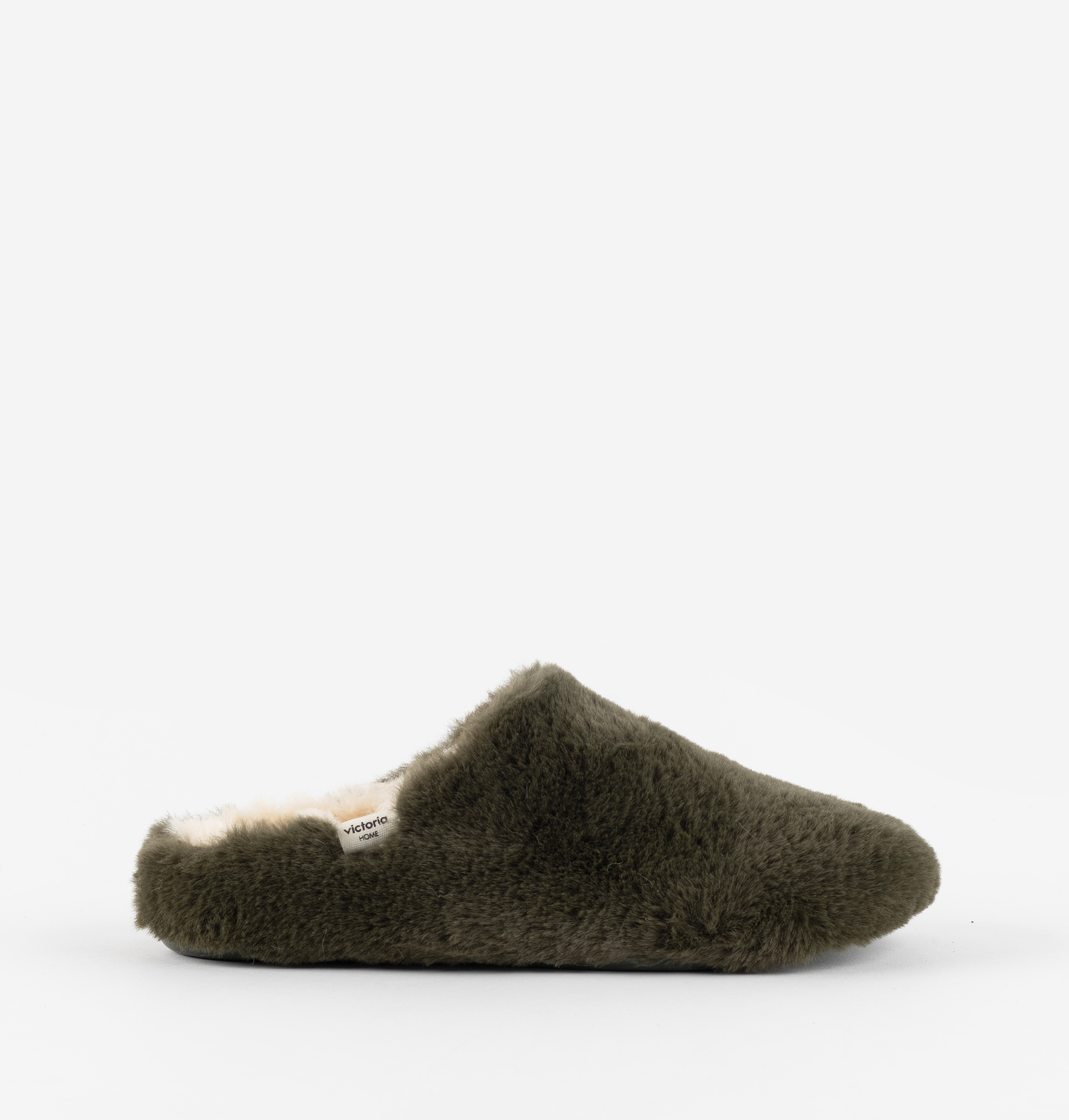 Zapatillas de casa abiertas para mujer fabricadas en España en pelo suave. Interior en contraste. Etiqueta lateral de victoria. Presentan una plantilla interior recubierta también de pelo que aporta confort y calidez. Cómoda suela de caucho vulcanizado.