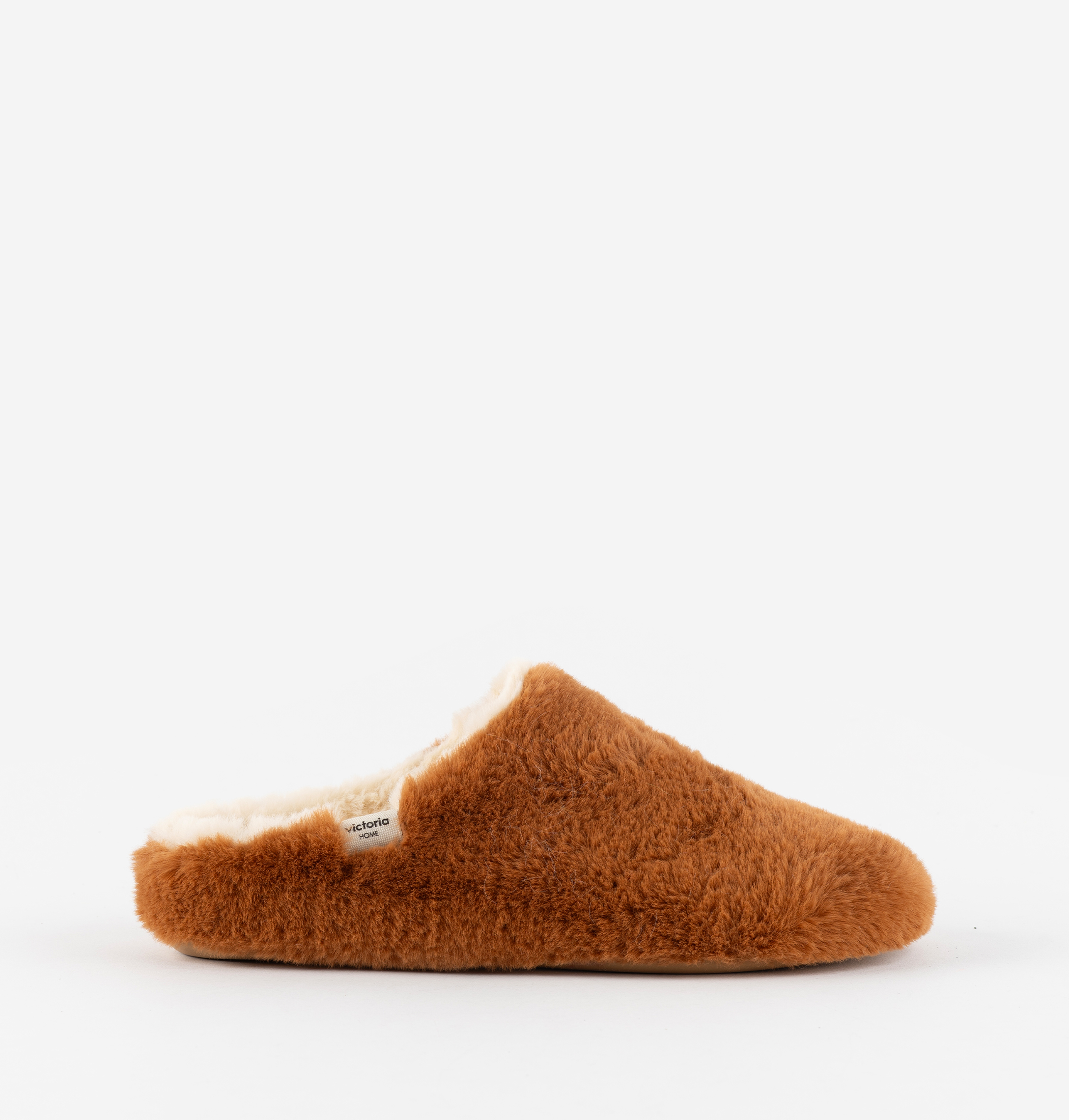 Zapatillas de casa abiertas para mujer fabricadas en España en pelo suave. Interior en contraste. Etiqueta lateral de victoria. Presentan una plantilla interior recubierta también de pelo que aporta confort y calidez. Cómoda suela de caucho vulcanizado.