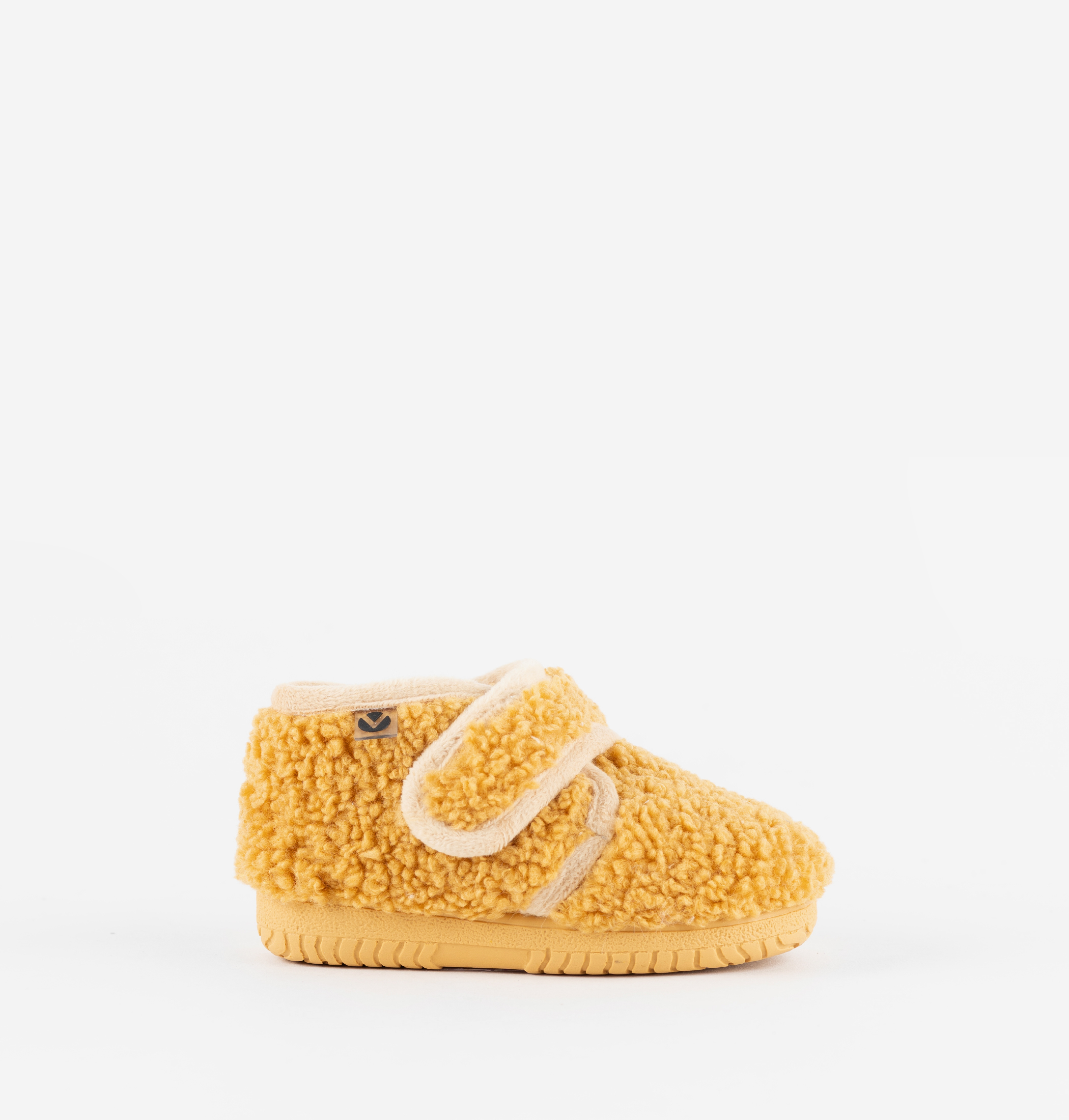 Zapatillas de casa cerradas para niños fabricadas en tejido de borreguito. El cierre de tira adherente les permite ponerlas y quitarlas con facilidad, fomentando su autonomía. Suela al tono de caucho vulcanizado.