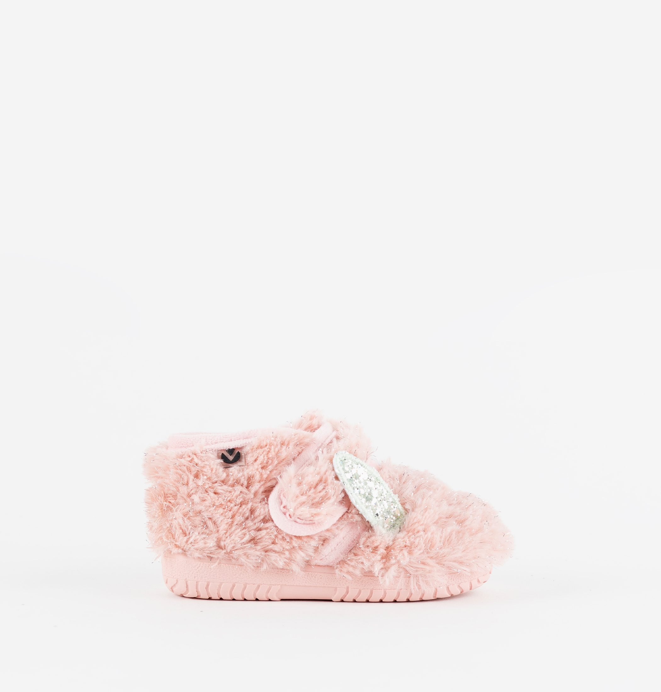Zapatillas de casa cerradas de pelo lurex con orejitas para niñas. El cierre de tira adherente les permite ponerlas y quitarlas con facilidad, fomentando su autonomía. Suela al tono de caucho vulcanizado.