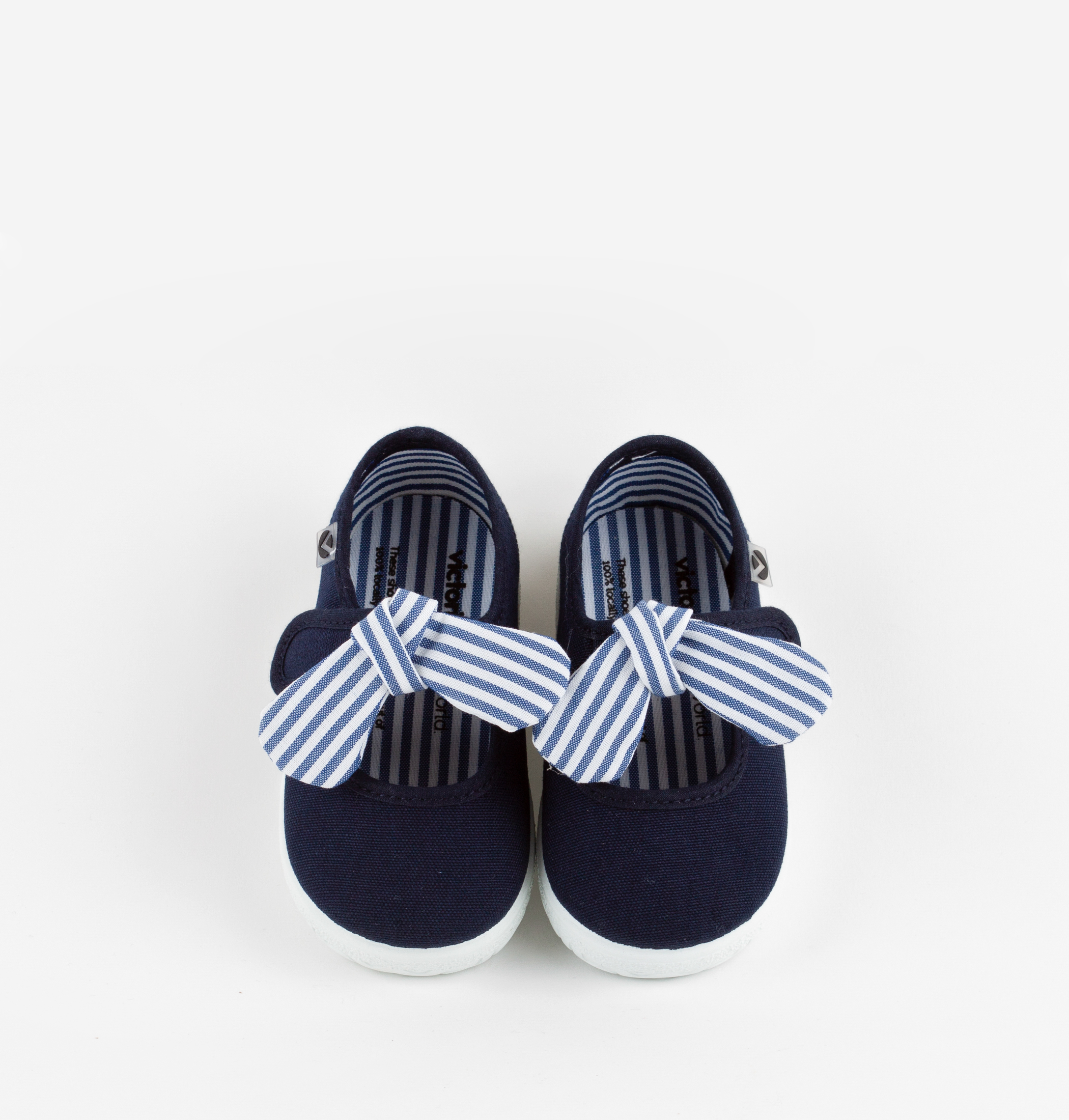 Merceditas para niños fabricadas en España en lona de algodón ecológico. Incorporan cierre con tira adherente para un ajuste fácil y seguro, que se acompaña de un pañuelo de rayas extraíble. Suela flexible de caucho vulcanizado.