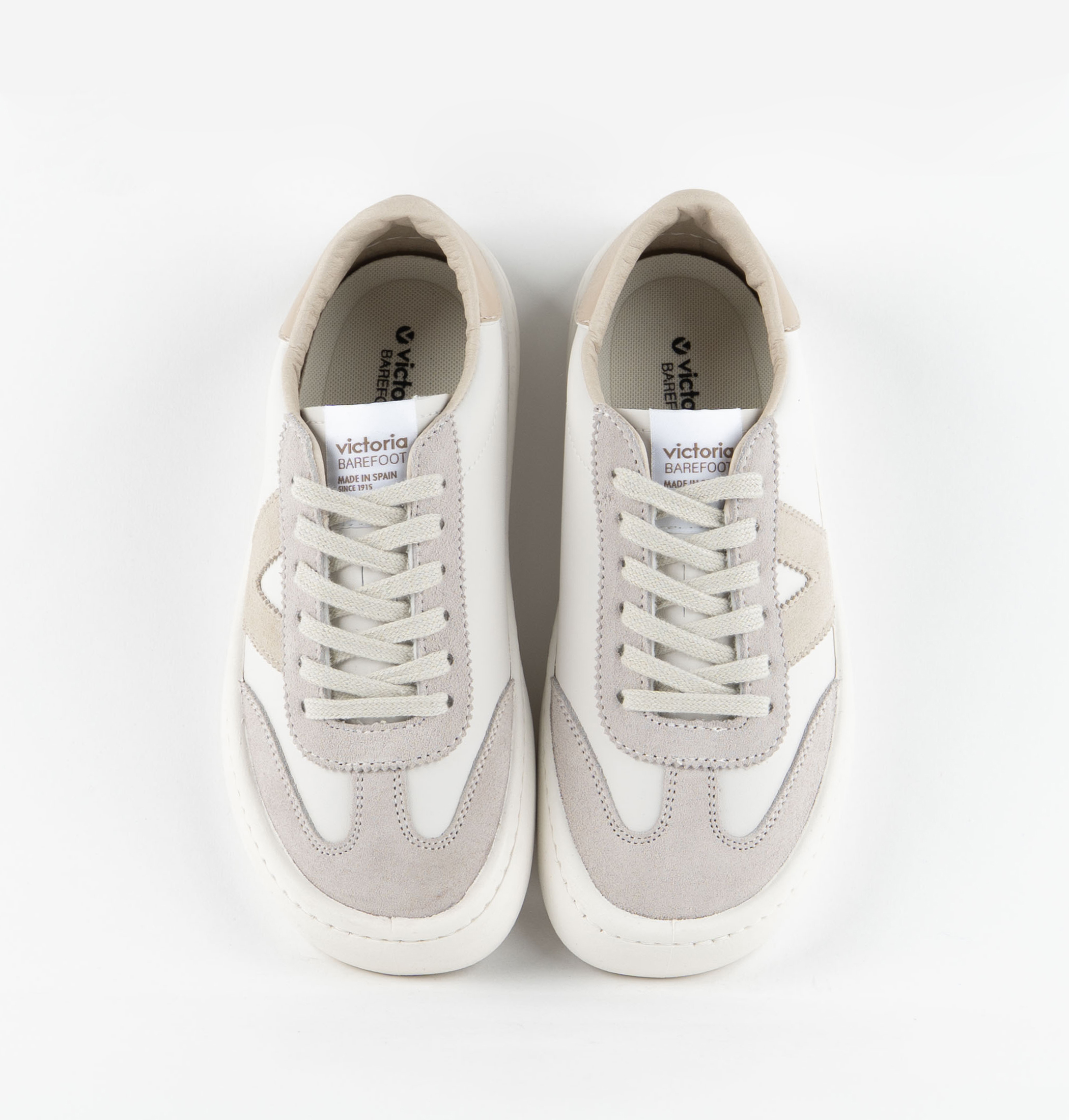 Están fabricadas en España en efecto piel blanca con piezas de color y serraje. La V de victoria lateral y la pieza trasera contrastan en colores a juego. Suela de PVC Flexible elaborada con aceites vegetales en lugar de minerales, reduciendo así el impacto medioambiental.