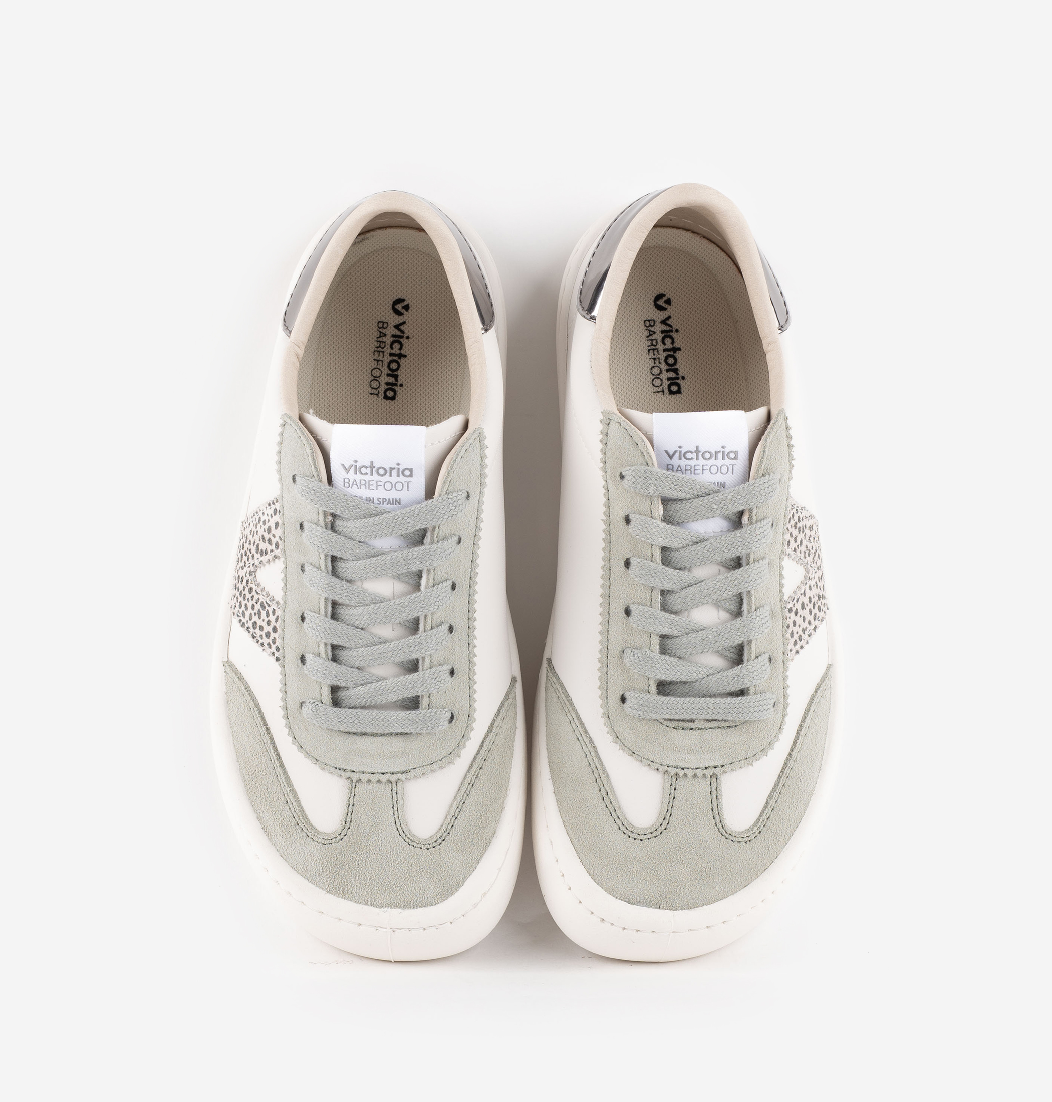 Están fabricadas en España en efecto piel blanca con piezas fantasía y de serraje. La V de victoria lateral se presenta en glitter y animal print, y la pieza trasera en tonos metalizados. Suela de PVC Flexible elaborada con aceites vegetales en lugar de minerales, reduciendo así el impacto medioambiental.
