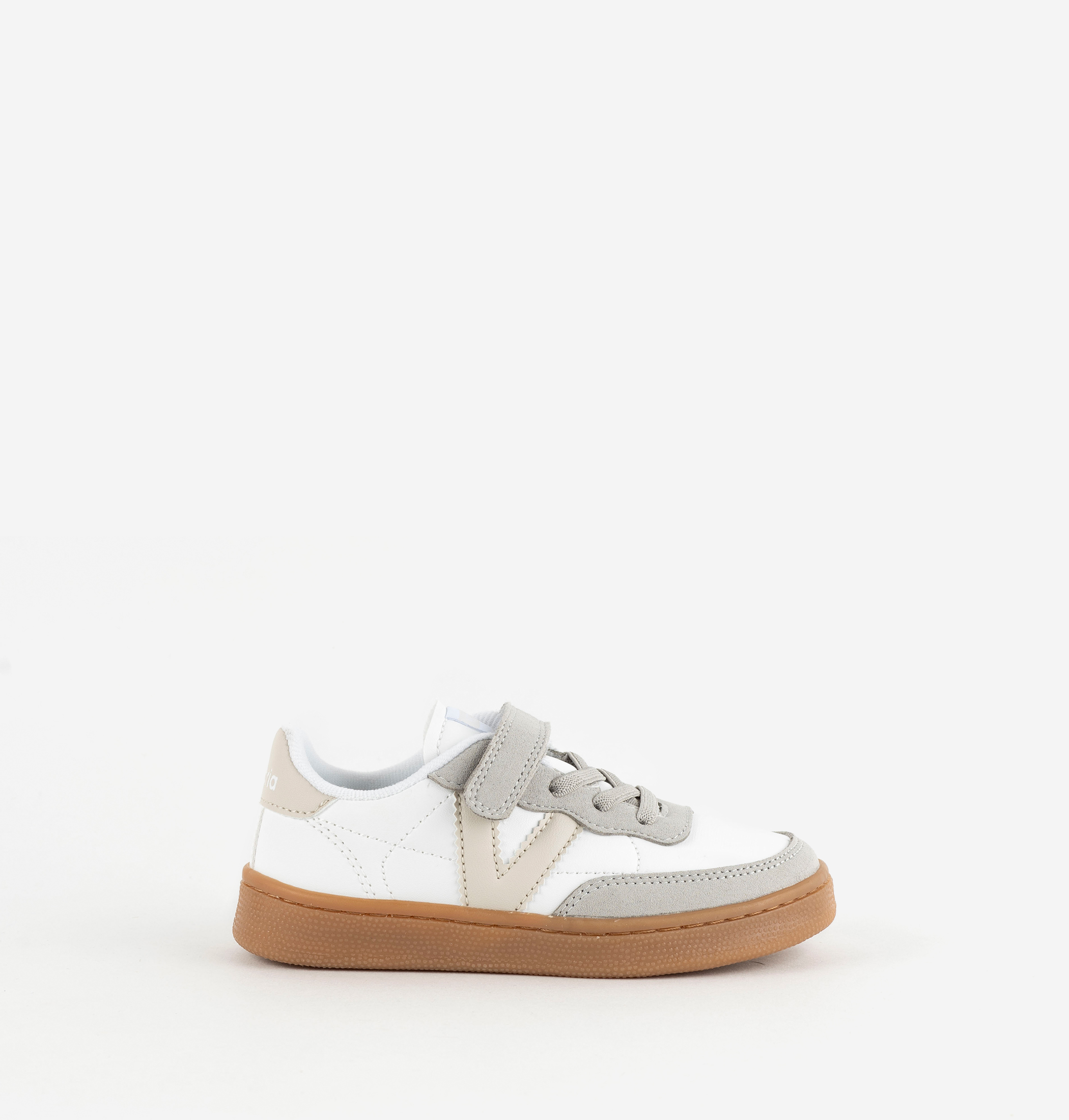 Zapatillas deportivas para niños fabricadas en efecto piel blanca y piezas de efecto serraje. Detalle de color en la V de victoria lateral, a juego con la pieza trasera, que presenta el logotipo de la marca grabado en blanco. Cierre mediante cordón elástico, que se acompaña de una tira adherente para facilitar el calce y aportar sujección, fomentando su autonomía. Cómoda suela de TPR en color caramelo.
